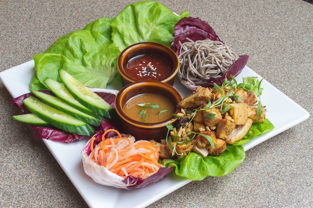 - Description: Grilled Tandoori chicken, bibb lettuce, pickled cucumber, carrots, radicchio, soba noodles, crushed peanuts served with ponzu and chili dipping sauces