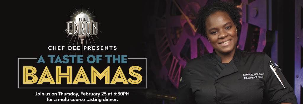Live the island life if only for one night at The Edison’s upcoming A Taste of the Bahamas Dinner! Presented by Executive Chef Deaundra “Dee” Rolle, the three course menu will feature unique flavors enhanced by delicious cocktail pairings.