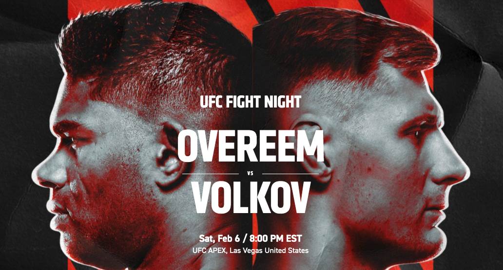 UFC Fight Night: Overeem vs. Volkov will be held Saturday, February 6 at 8 PM ET. Fight fans can watch live on ESPN+.