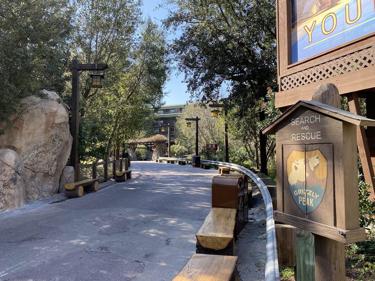 Meanwhile, in the Grizzly Peak Airfield, the barrier rope has been extended out once again to allow for dining at Smokejumpers Grill and the tables that have been placed in front of the Soarin’ building. Interestingly, the rope has been extended further then it was previously, going up to the Grizzly Peak billboard and allowing for guests to get up close to the Cessna plane that has been parked underneath the billboard since the park opened 20 years ago.