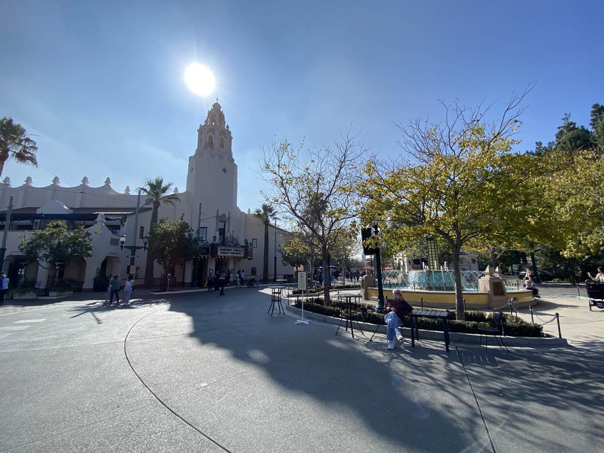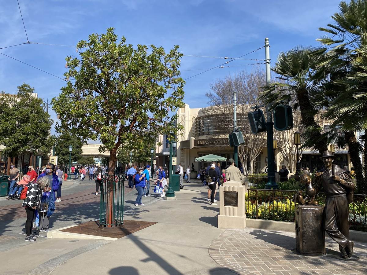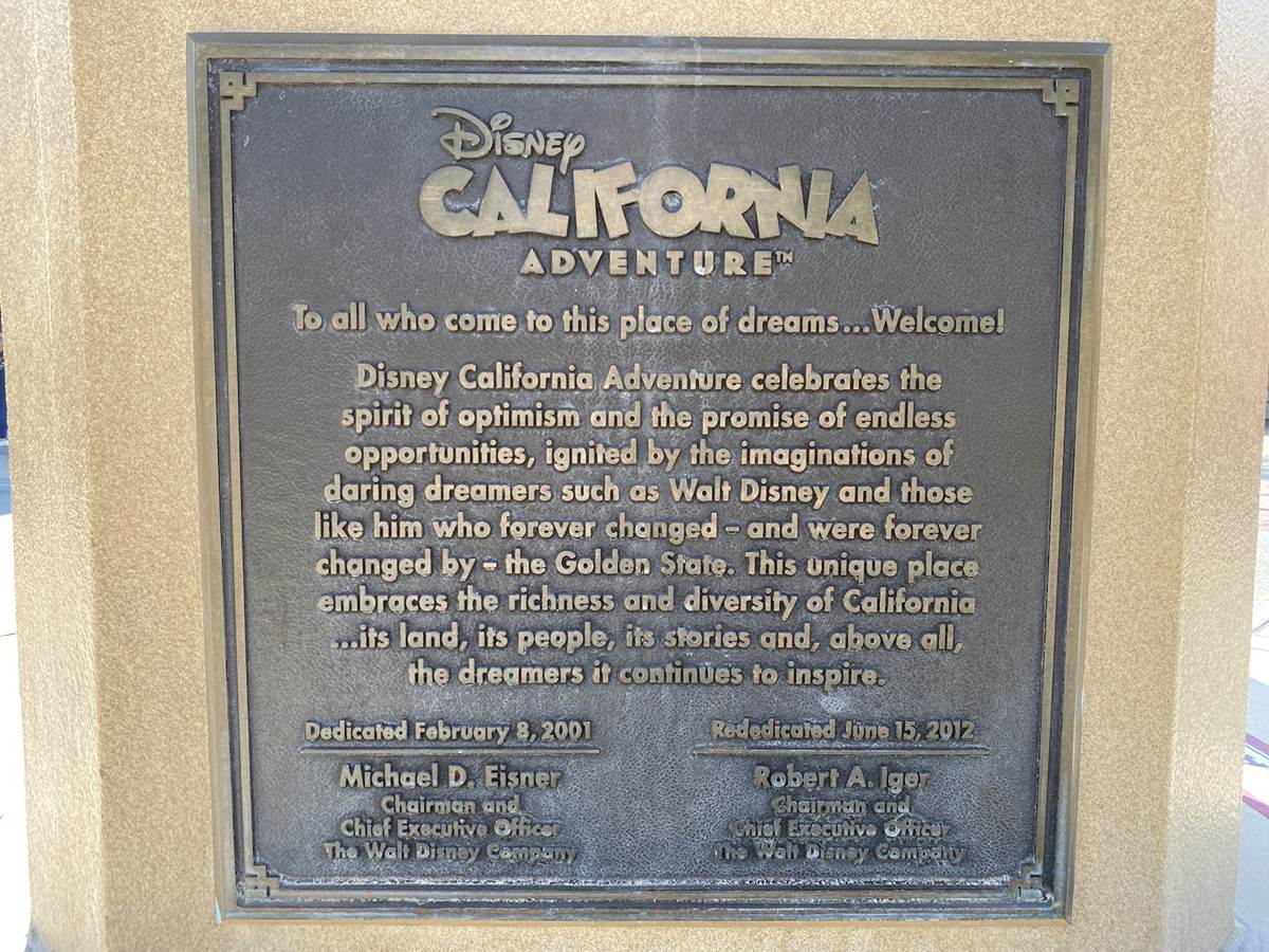 Let’s start at the entrance of the park, which looked quite a bit different 20 years ago than it did today. Gone is the faux Golden Gate Bridge and the letters spelling out the name of the state, and here today is a bustling city street from a bygone era. A plaque in the entry plaza now carries a speech by then-CEO Bob Iger when the park was rededicated in 2012, replacing a speech given by then-CEO Michael Eisner from when the park opened in 2001. The speeches do differ, but maintain the same spirit.