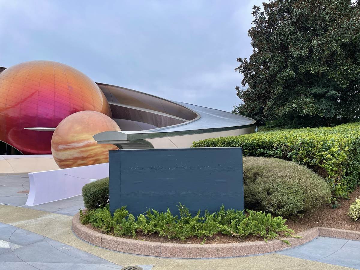 Something that was originally announced to be open in time for the 50th anniversary of Walt Disney World, Guardians of the Galaxy: Cosmic Rewind is definitely showing signs that work is continuing. The former tiled entryway to the Universe of Energy is currently being replaced, as evidenced by new woodwork shaping the exterior of the massive building. Solar panels that once adorned the roof and partially powered the original attraction have been removed, perhaps to be replaced by newer, more efficient models.