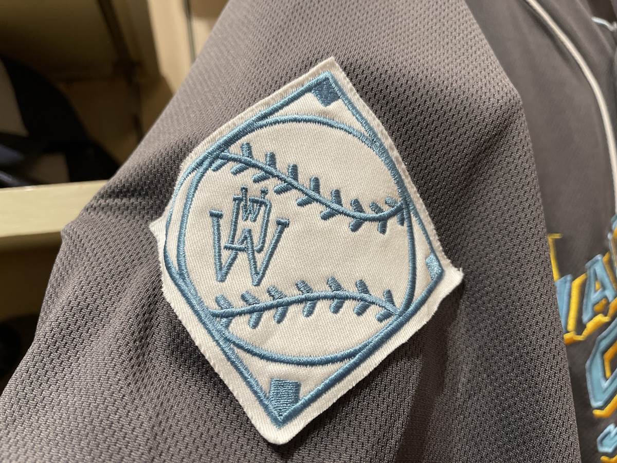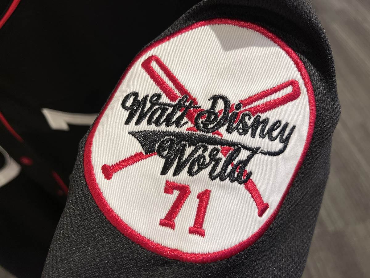 The patch on this jersey’s sleeve is shaped like a baseball diamond and has a baseball with “WDW” engraved on it.