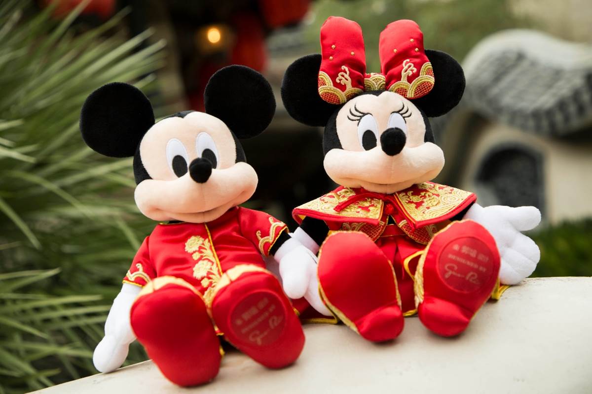 - And of course, there is special merchandise as well. Here are some plushes of Mickey and Minnie dressed in their Spring Festival outfits made by Chinese designer, Guo Pei.