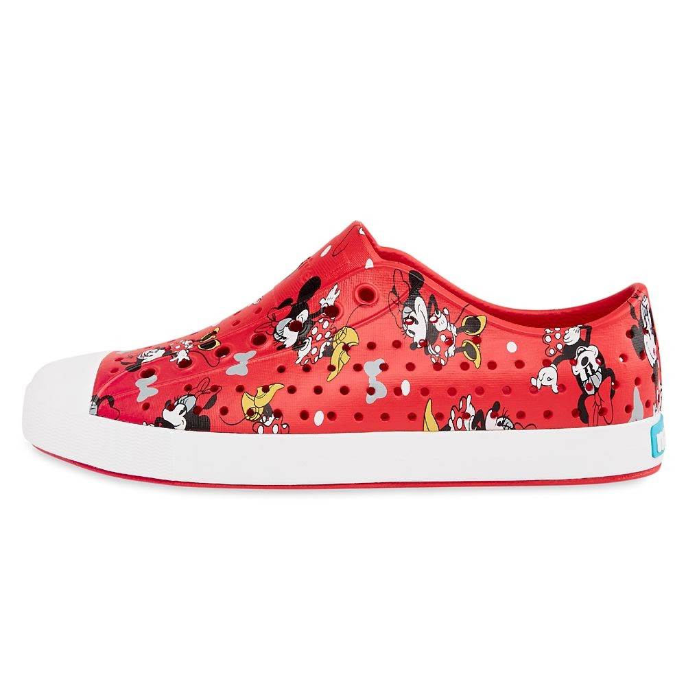 - The adults’ Jefferson shoe is Native Shoes’ original EVA all-star, embodying the company’s token lightness with a durable rubber rand and toe. Available in a black Mickey all-over print and a red Minnie all-over print, the shoe is shock absorbent, odor resistant, and hand washable. Both these styles come in women’s size 5 to men’s size 12.