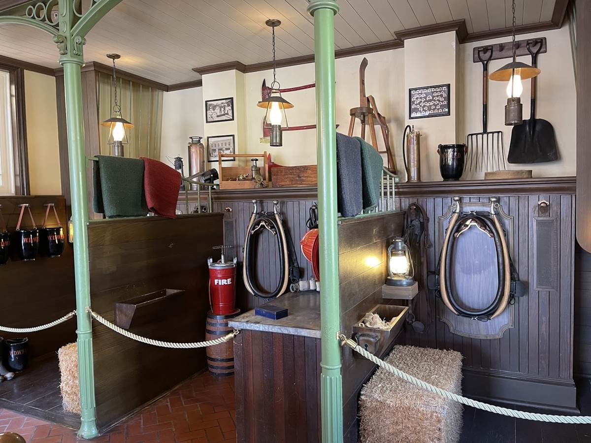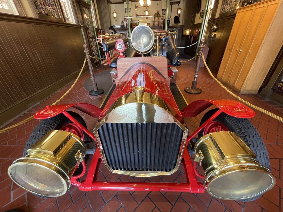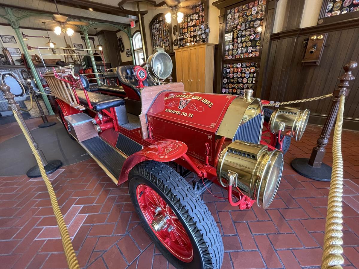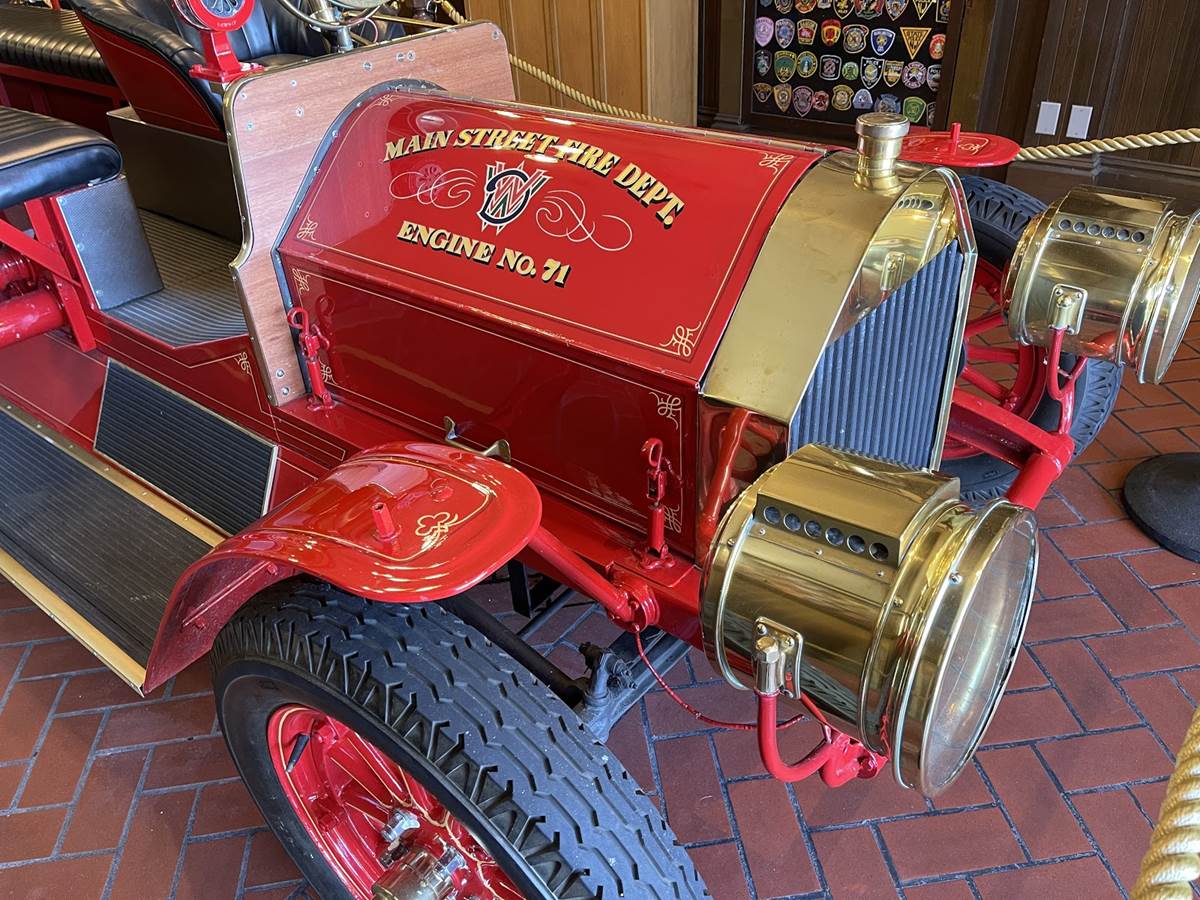 On display, centered in the firehouse, is one of the classic Main Street Vehicles, the popular fire truck that would go up and down Main Street USA carrying passengers one way to Cinderella Castle, or back down again to Town Square. The truck was also used in the former Family Fun Day Parade, and by the residents of Main Street USA (streetmosphere characters), namely Chief Smokey, the fire chief.