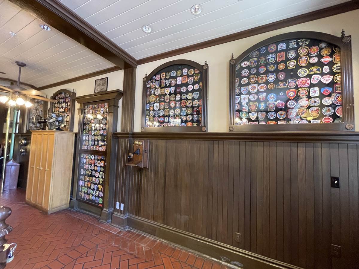 Guests from fire departments around the country have donated patches to the Main Street Firehouse, which remained displayed on the wall, even in the days of Sorcerers of the Magic Kingdom, and are still there today.