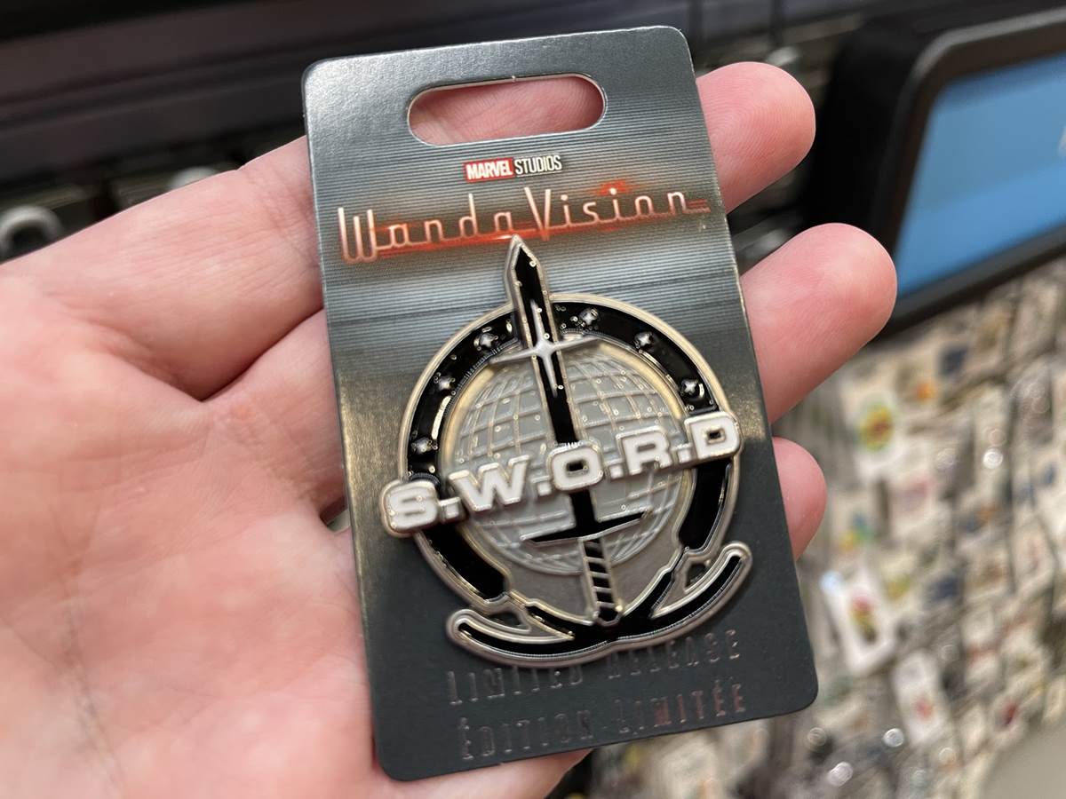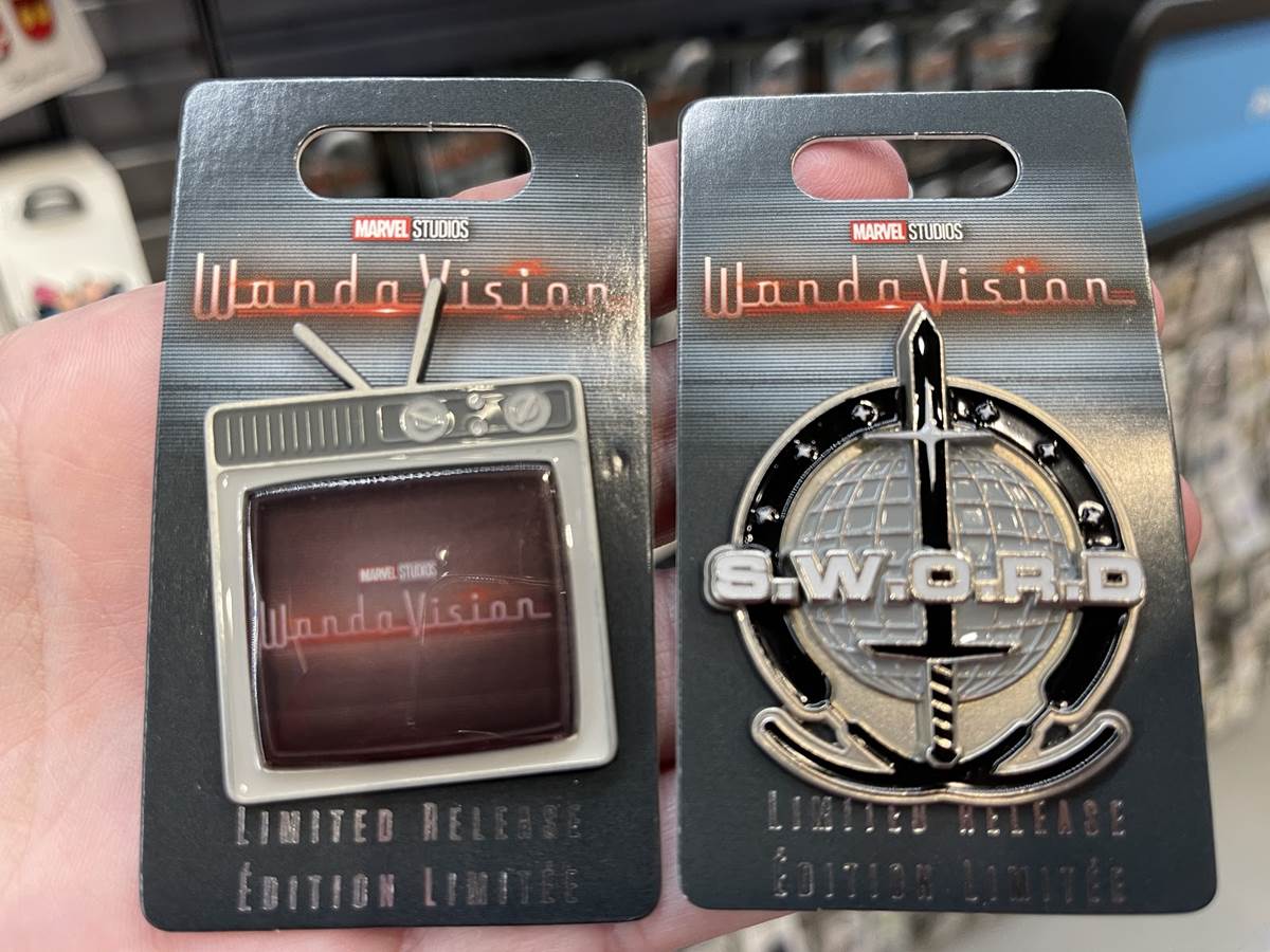 - Both pins spotted are limited edition, one being a retro TV with the WandaVision logo being broadcasted and the other is the S.W.O.R.D. logo as seen on the show, better known as the Sentient Weapon Observation and Response Division.