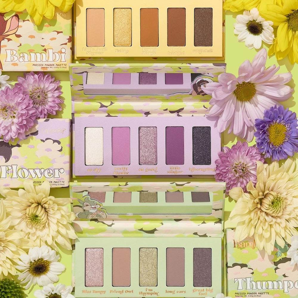 The collection features three new eyeshadow palettes offering a warm red and brown color scheme for Bambi, a cool purple palette for Flower, and a soft color palette for Thumper. Each eyeshadow palette includes at least two glittery shades that will make eyes glow.