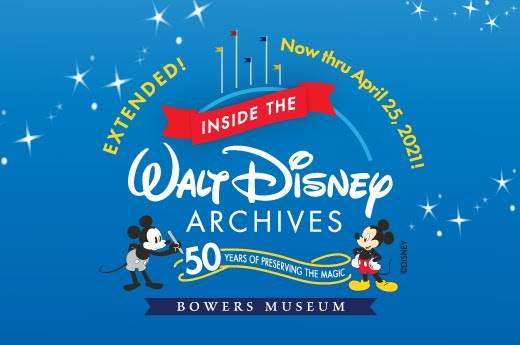 - The Walt Disney Archives and Bowers Museum has announced an extension of the exhibition, Inside the Walt Disney Archives: 50 Years of Preserving the Magic through April 25, 2021.