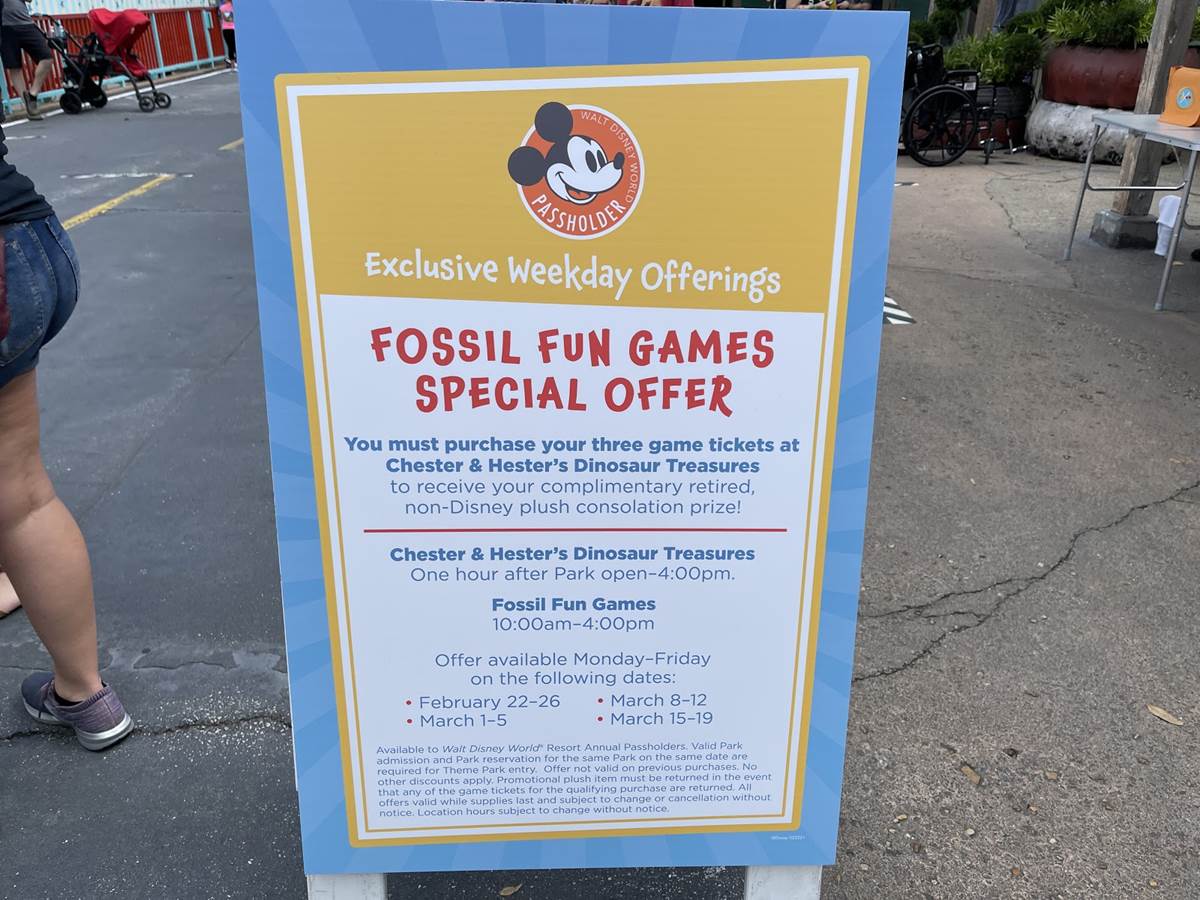 - Complimentary Retired (non-Disney) Plush Prize at Chester & Hester’s Dinosaur Treasures with Purchase of 3 Game Tickets.