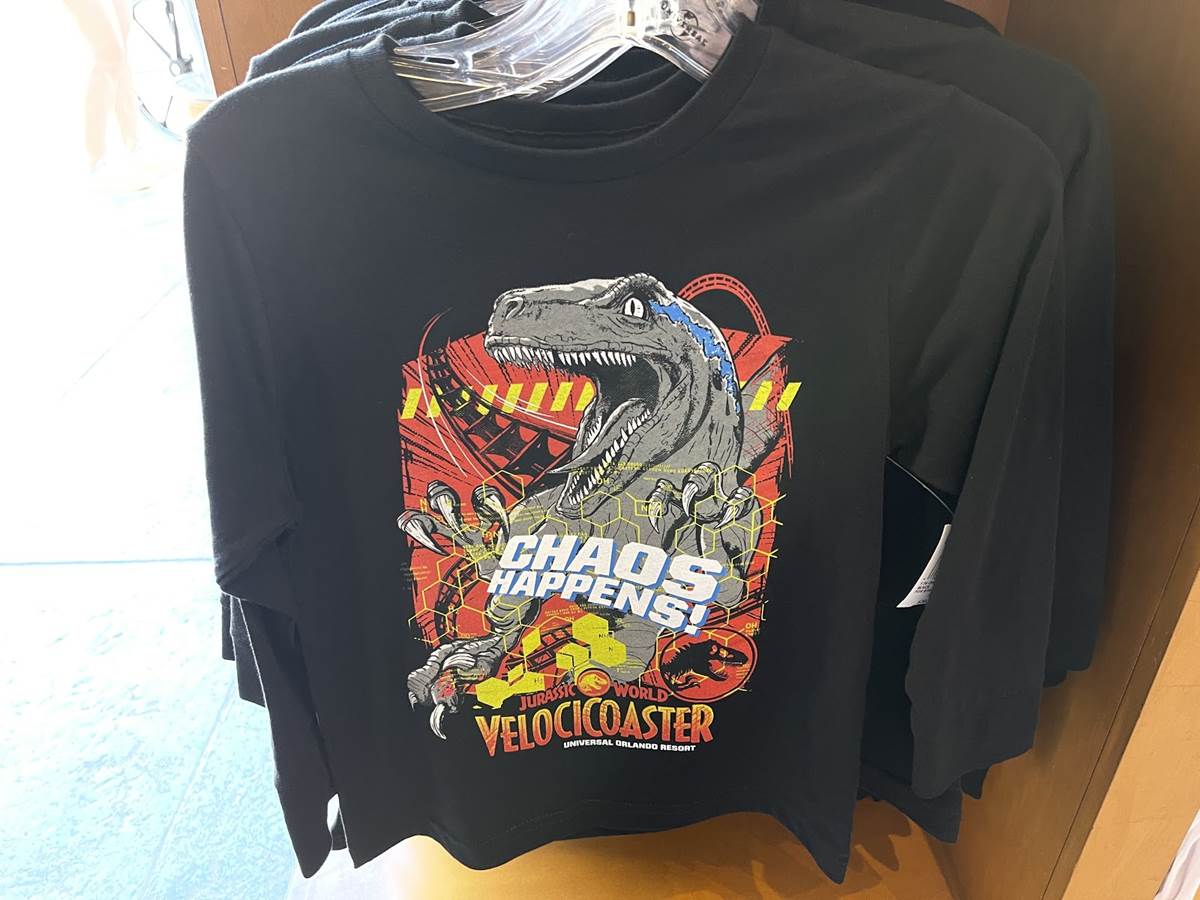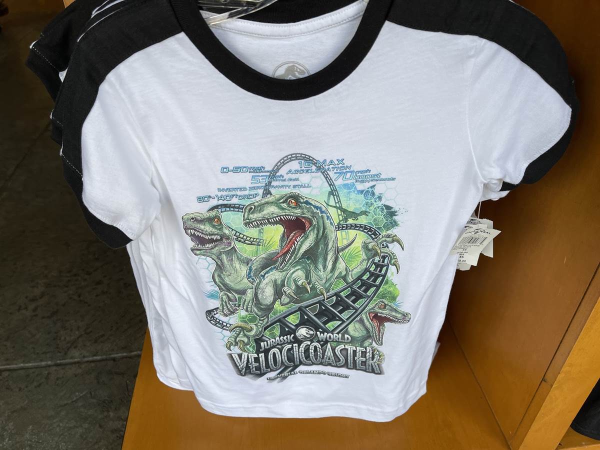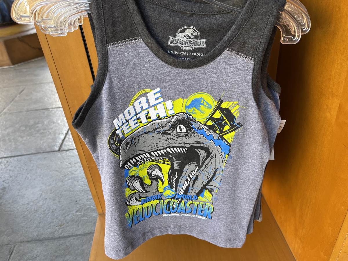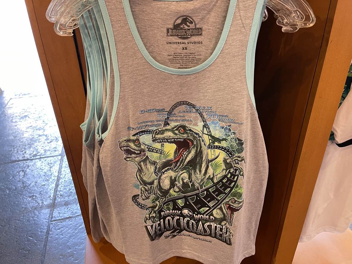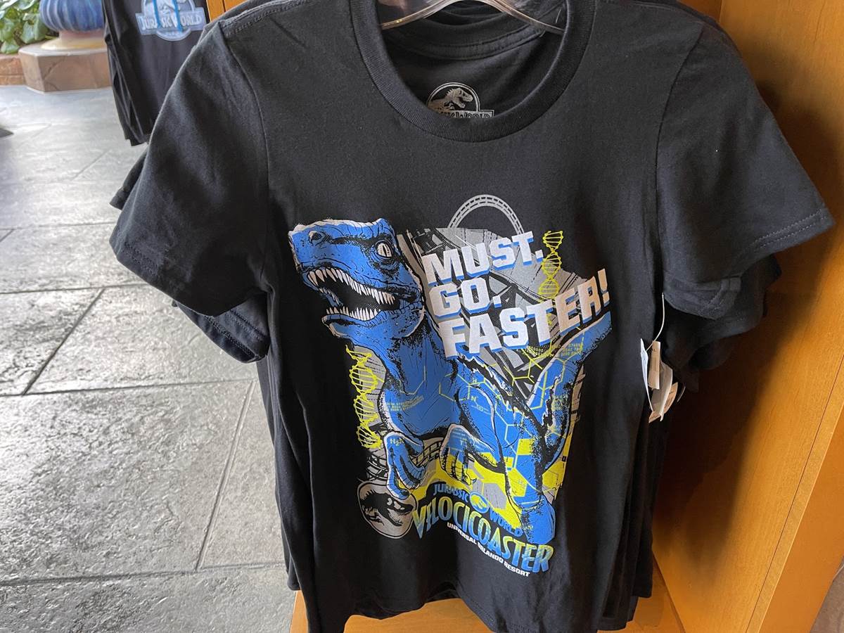 Shirts are available, including one that features an iconic quote from the original Jurassic Park, “Must Go Faster,” though that was in a scene featuring the T-Rex, and not the Velociraptors. The logo for the new coaster is also carried over into a tank top.