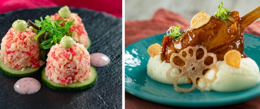 - Soy-glazed Pork Shank with Truffle Mashed Potatoes, Crispy Lotus Flower, Garlic Chips, and Green Onion.