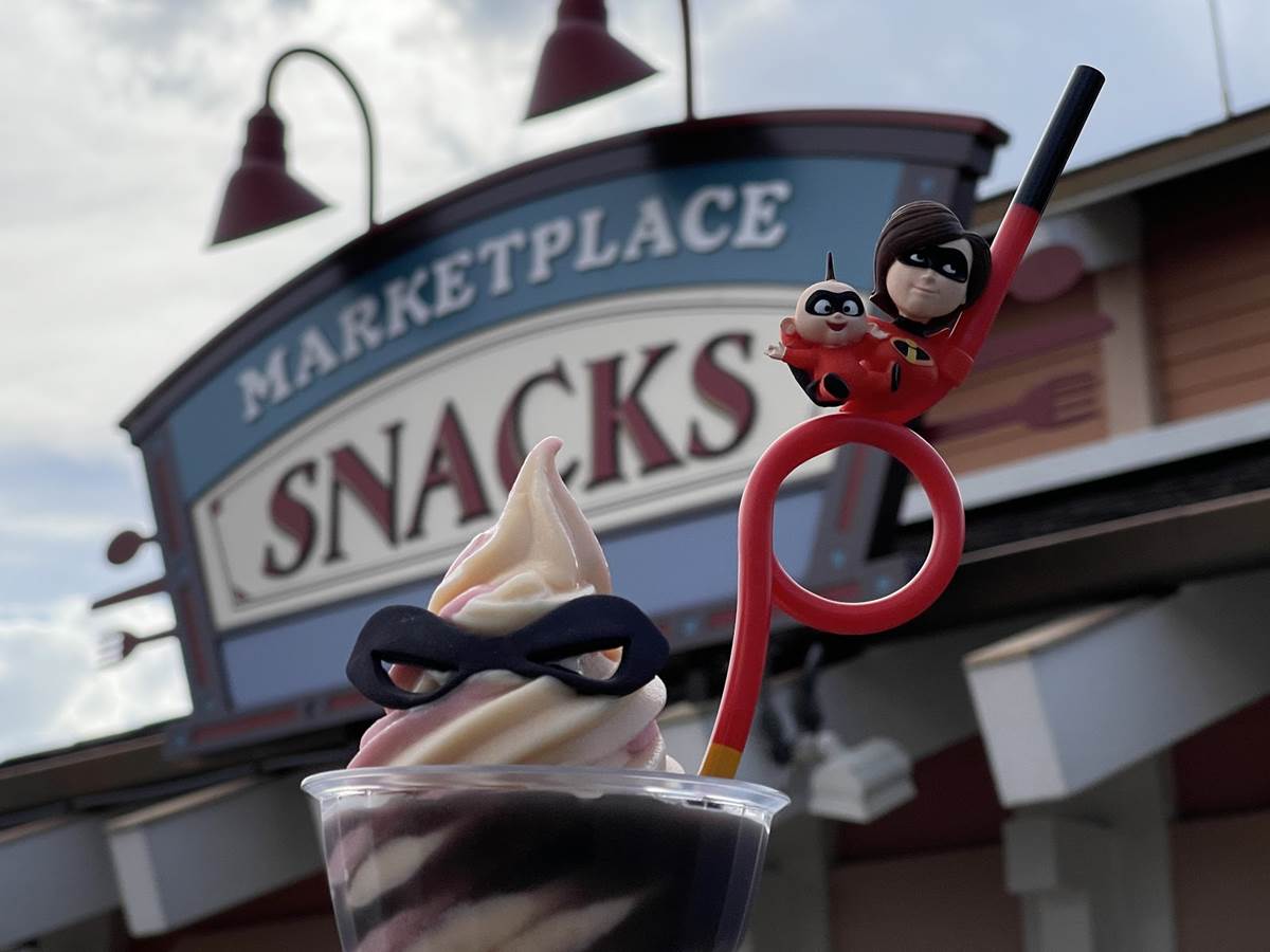 That brings us right into one of the limited-time desserts, the Mrs. Incredible Float from Marketplace Snacks. It features strawberry and lemon DOLE Whip soft serve with black cherry lemonade and a Mrs. Incredible straw where the super mom is also holding Jack Jack.