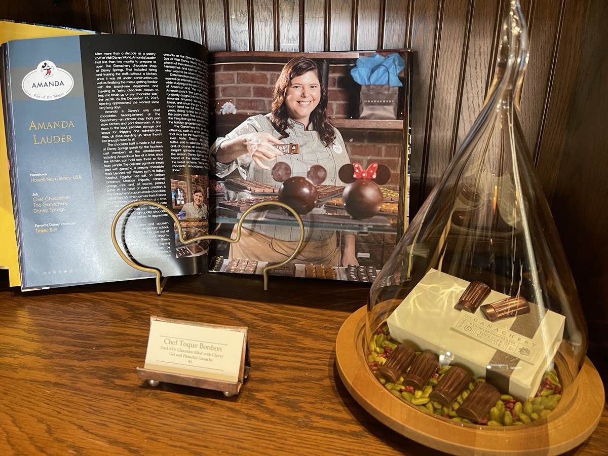 Chef Amanda, who was featured in One Day at Disney, is offering two treats at The Ganachery. First is her Chef Toque Bonbon filled with Morello cherry gel and pistachio ganache.