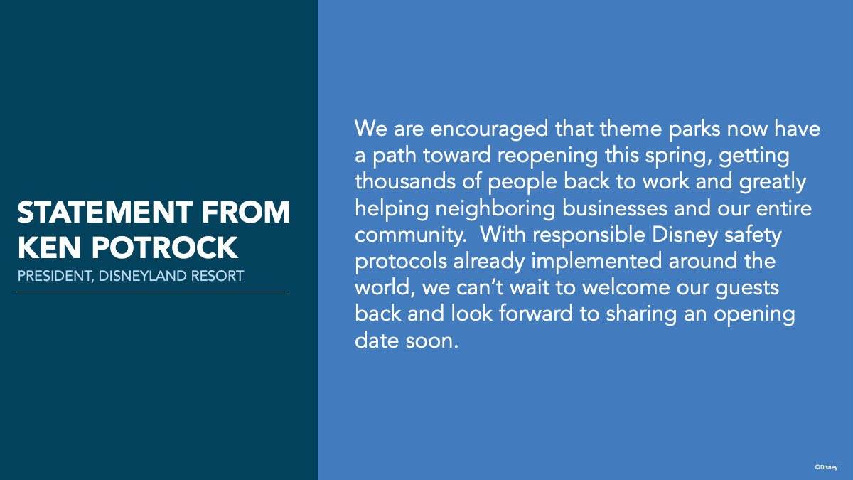 - Disneyland Resort President Ken Potrock was hopeful with this news, and issued a statement.