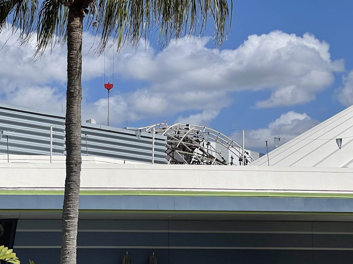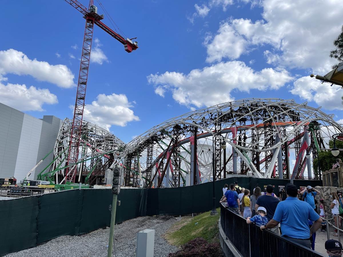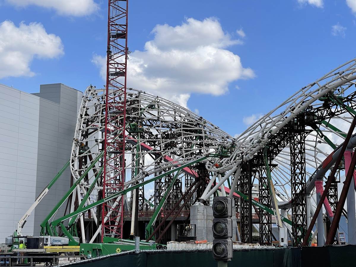 More of the canopy support structure has been added over the track, most noticeably by the attraction’s show building.