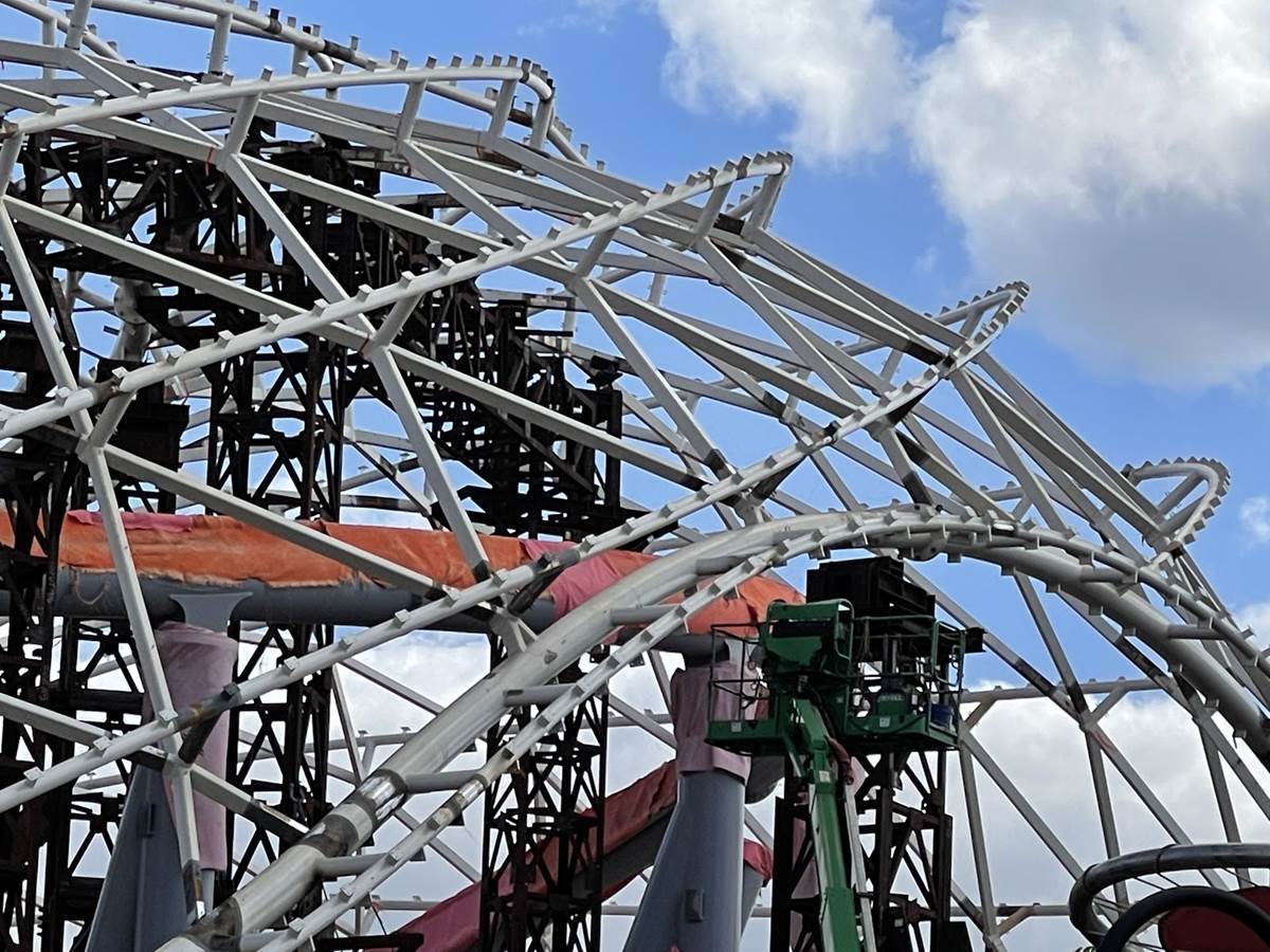 The track of the coaster has been wrapped to protect it while the canopy and light rigs are installed.