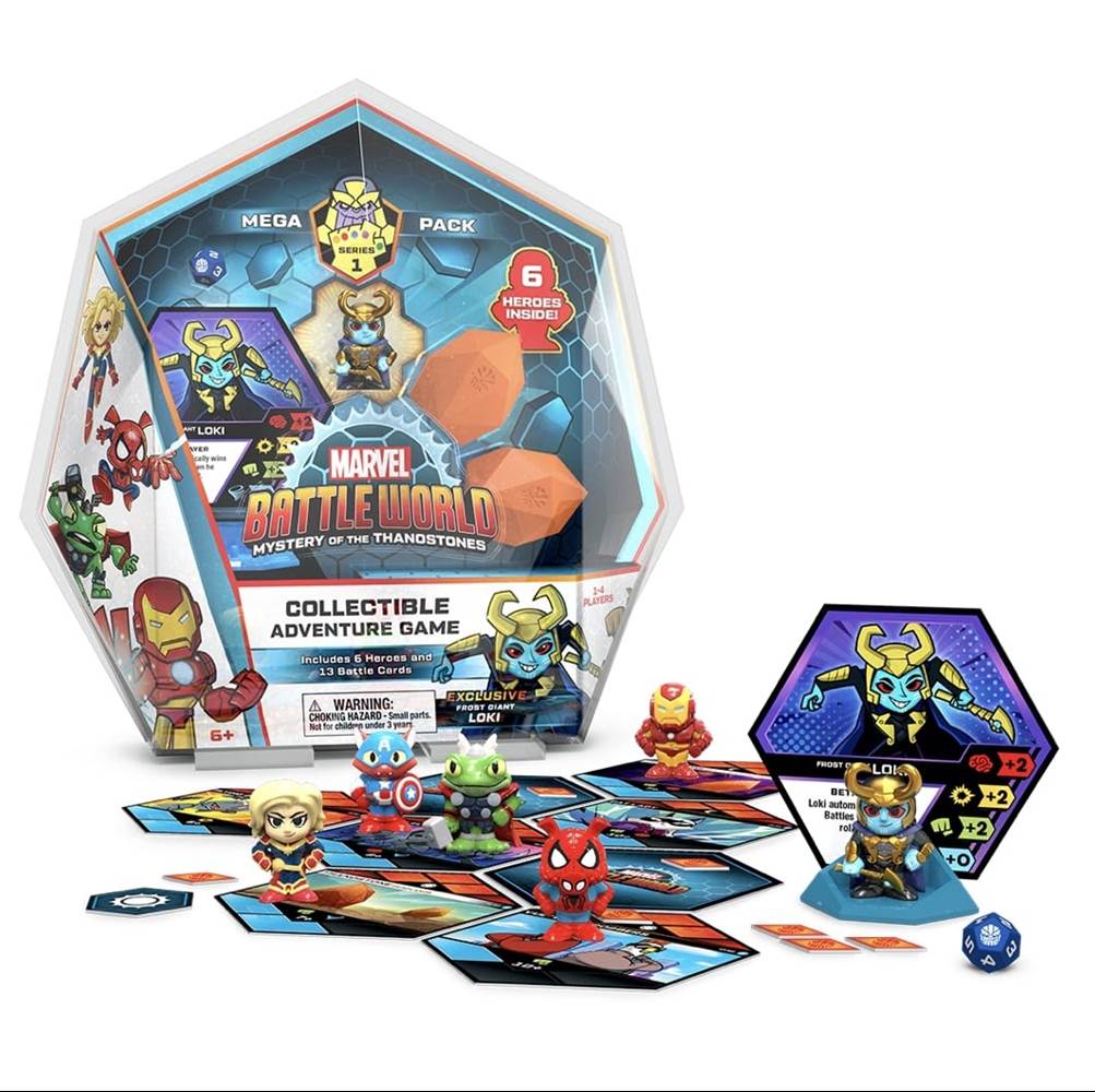 - “Pick your favorite Hero, rescue your friends, and win battles to defeat Thanos! Battleworld is a revolutionary, cooperative, expandable, collectible adventure game featuring dozens of characters from all over the Marvel Universe! Players get to crack open the mysterious Thanostones during the course of play to reveal the mystery character inside for a constant sense of surprise and delight! Mega Packs let you jumpstart your collection with six characters: four starting Heroes [including an exclusive Loki (Frost Giant) variant] and two more trapped in Thanostones!”