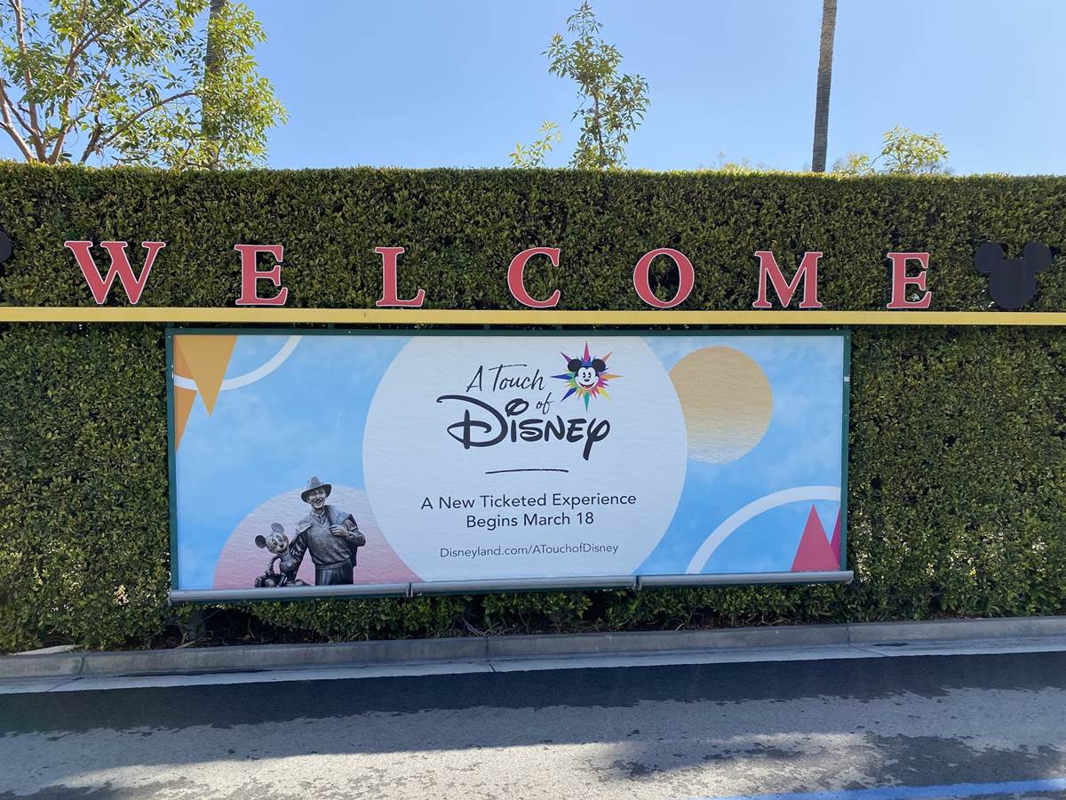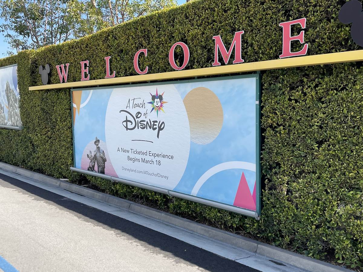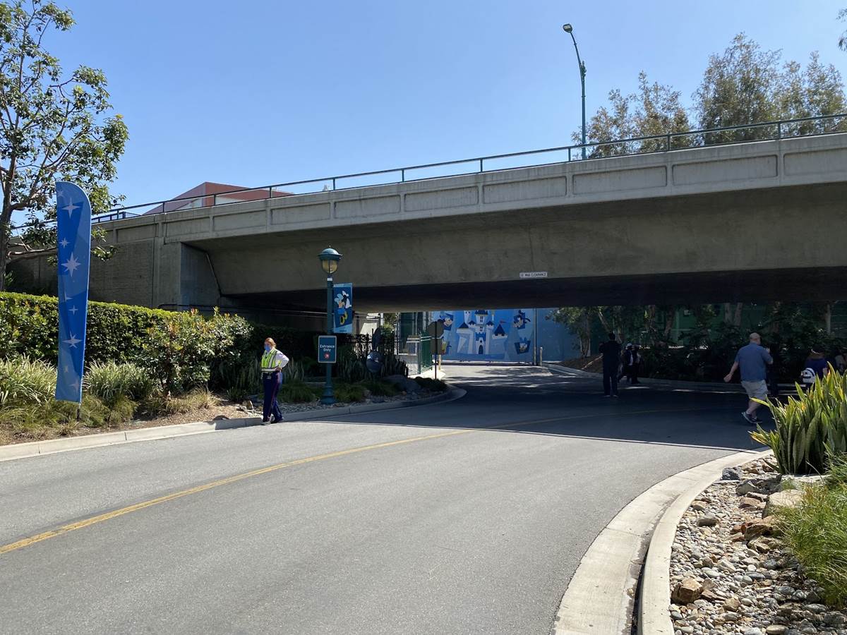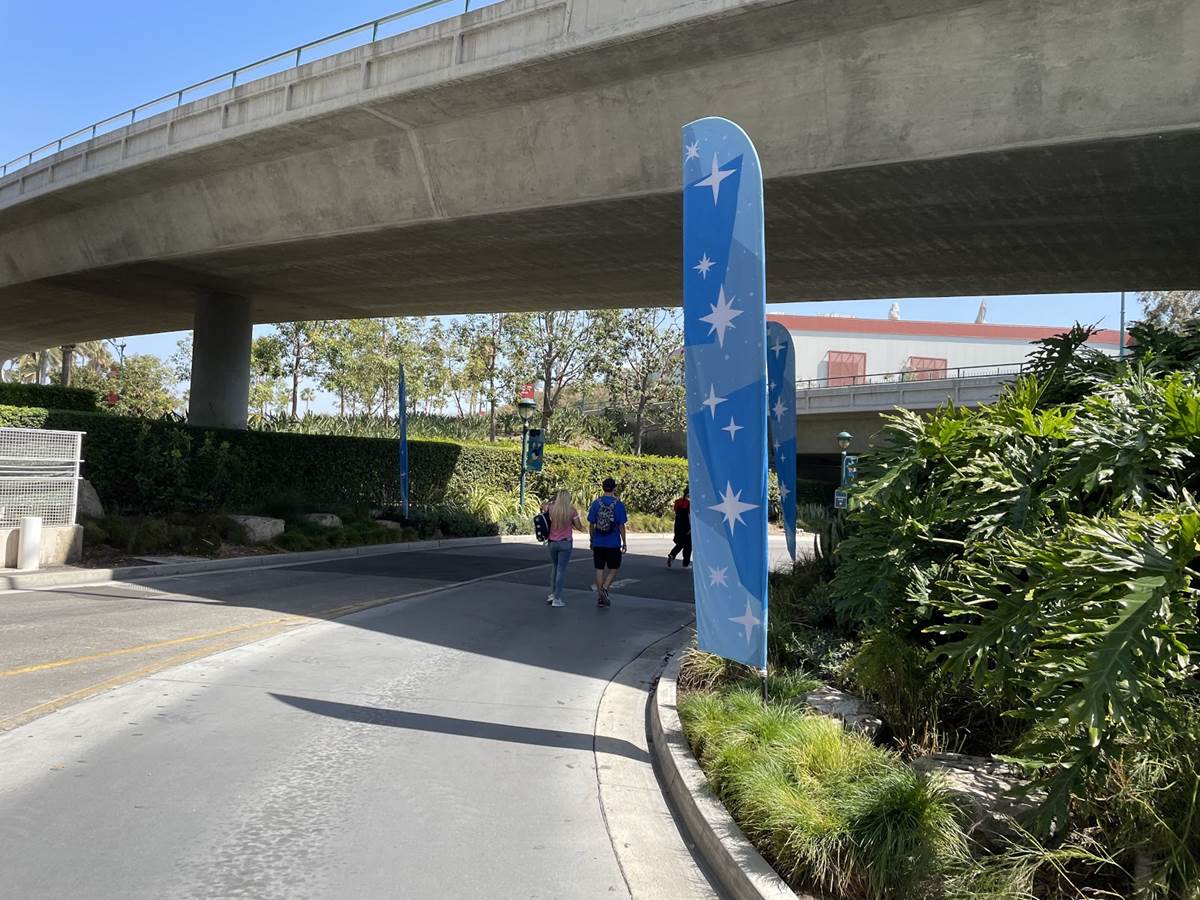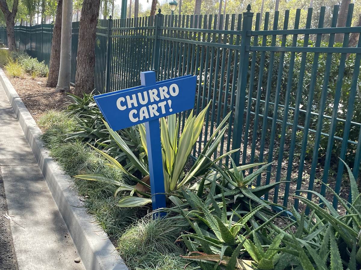 After the temperature check the long walk begins. Parking trams aren’t running during this event, so the lane has become a dedicated walkway into the resort. It’s a good thing the temperatures are taken at the garage, otherwise the walk in the Southern California heat could lead to an abundance of guests not being able to get in, at least without a rest and recheck. Along the walk are numerous billboards advertising and welcoming those to the Touch of Disney event, and as you get closer to the resort proper, designs featuring favorite characters and stylized park icons. There are also little road signs promising a churro stand in the distance.