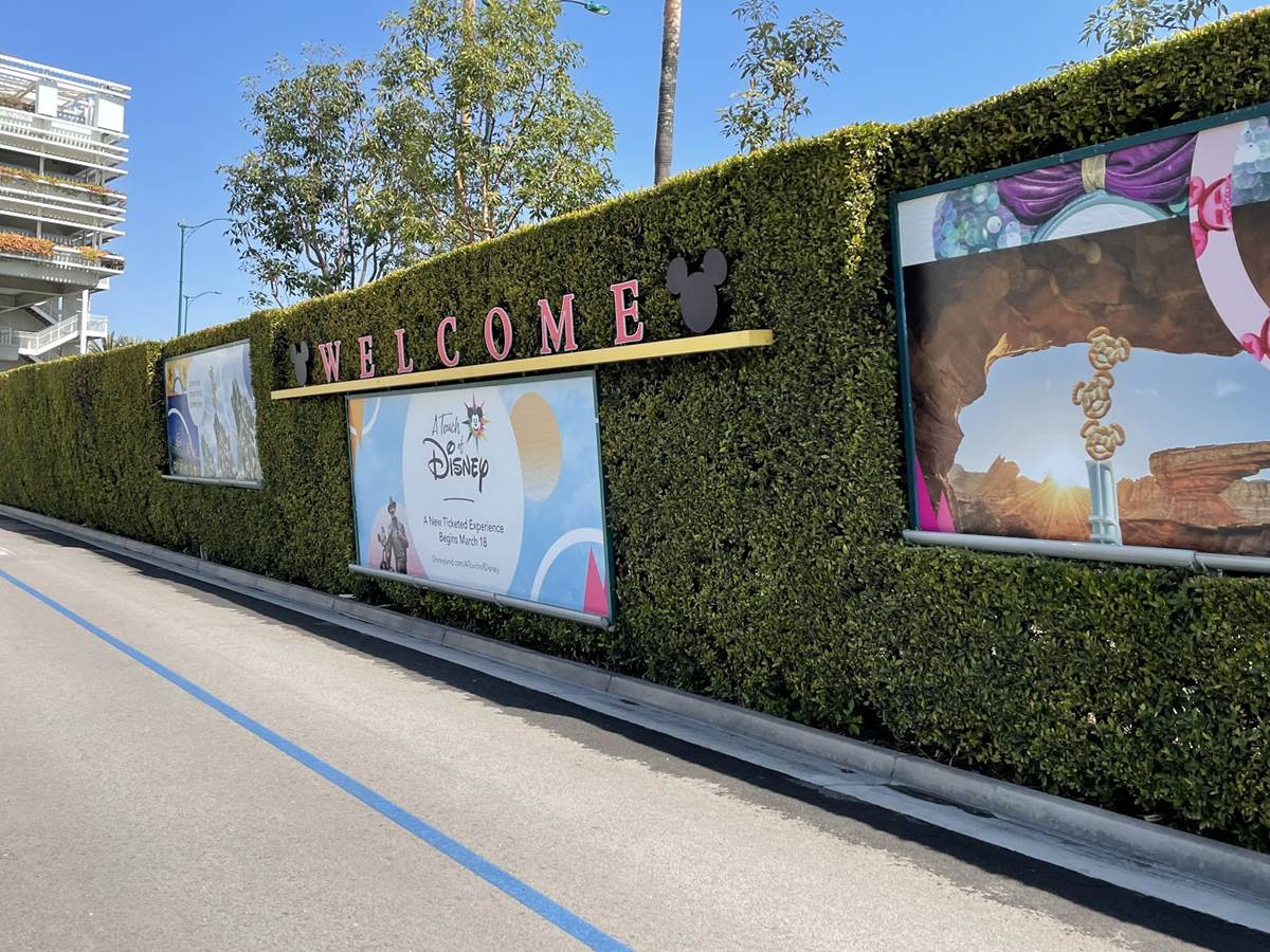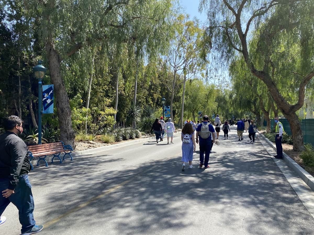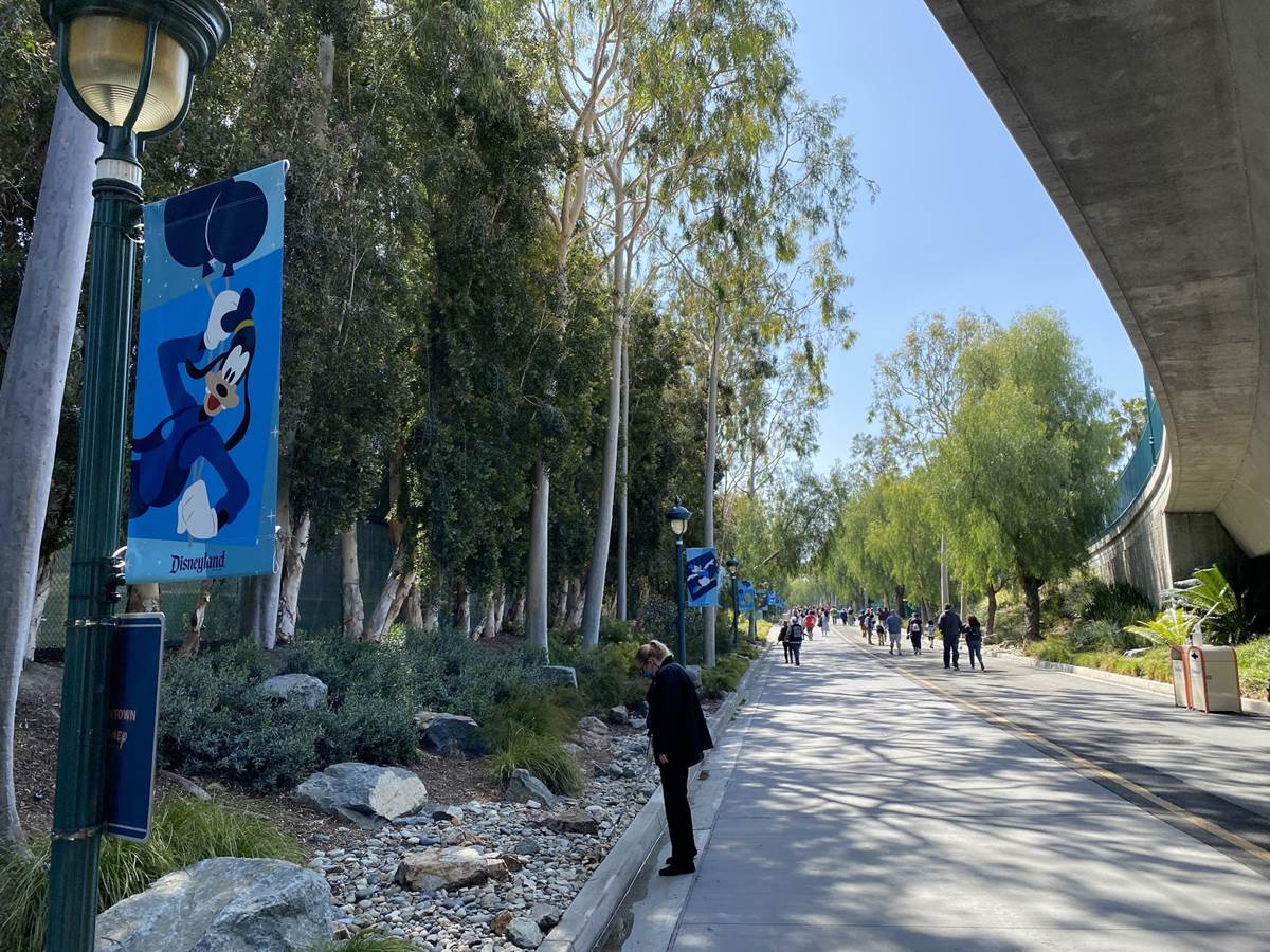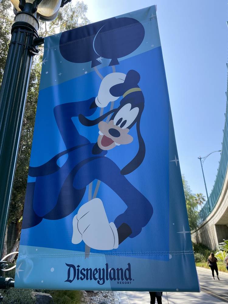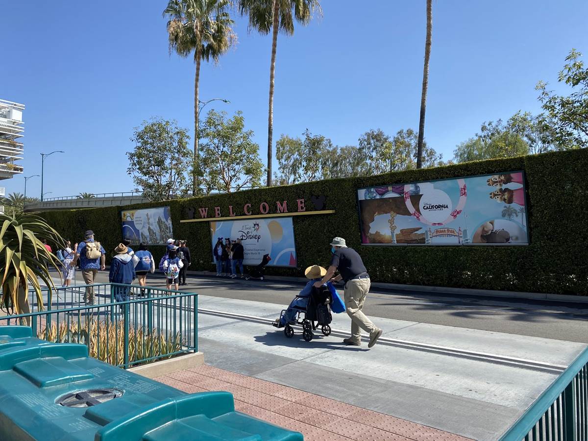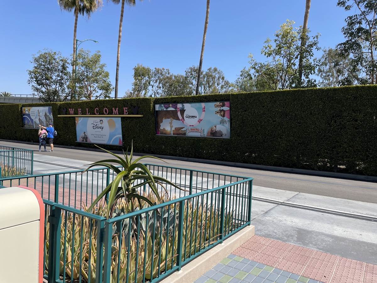 After the temperature check the long walk begins. Parking trams aren’t running during this event, so the lane has become a dedicated walkway into the resort. It’s a good thing the temperatures are taken at the garage, otherwise the walk in the Southern California heat could lead to an abundance of guests not being able to get in, at least without a rest and recheck. Along the walk are numerous billboards advertising and welcoming those to the Touch of Disney event, and as you get closer to the resort proper, designs featuring favorite characters and stylized park icons. There are also little road signs promising a churro stand in the distance.