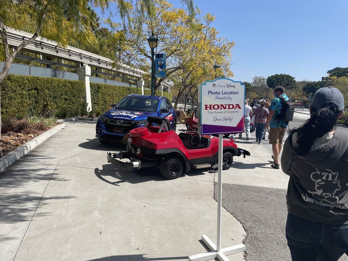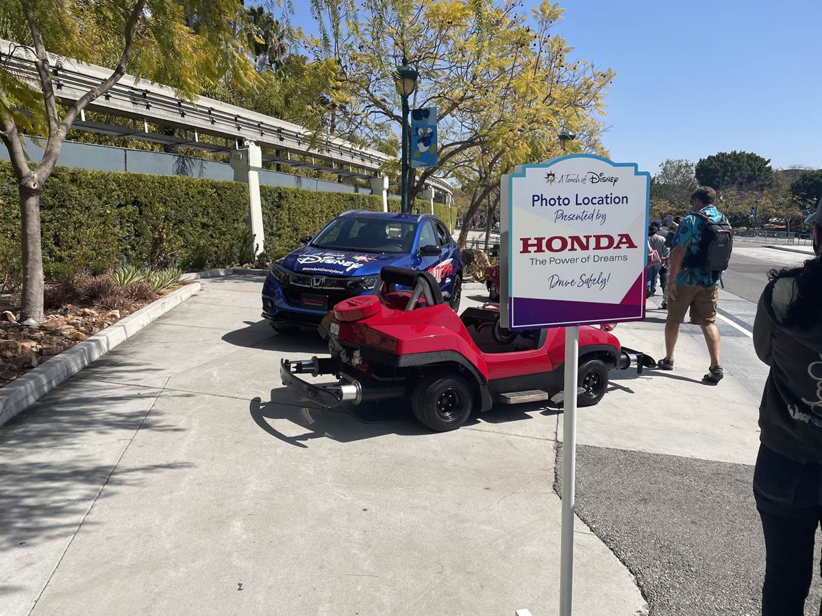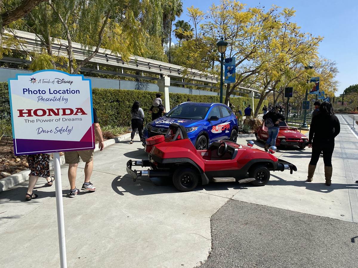 Or, you might even encounter ride vehicles stationed on the pathway itself, like this photo op featuring Autopia cars, presented by Honda. Guests can climb in and take photos with the vehicles, and cast is nearby to clean accordingly.