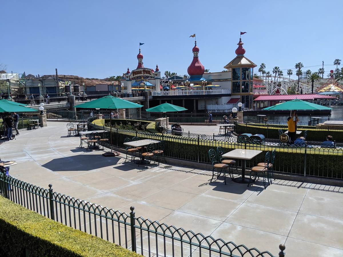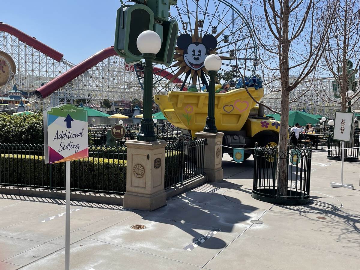 Throughout the park, outdoor seating like that in Pacific Wharf is enjoyed, and tables have been set up where they haven’t been before, including some in areas you’d never think to see them. Like these ones, in the Paradise Gardens Park, AKA The viewing area for World of Color.