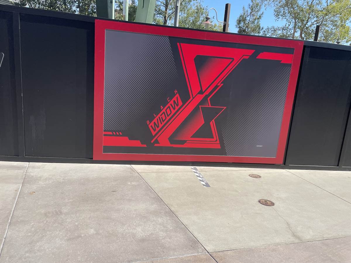 Avengers Campus, the next big land coming to Disney California Adventure is arriving soon, but not just yet. We can get a small glimpse near the D-Lish cart of the event, and the construction walls in the area are covered with billboards promoting the upcoming Black Widow.