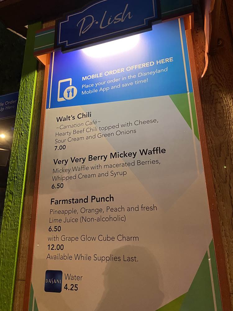 D-Lish, as close as you can get to the yet-to-open Avengers Campus, is serving up Walt’s Chili from the Carnation Cafe on Main Street USA, as well as a Very Berry Mickey Waffle and Farmstand Punch.