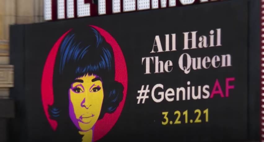- The Genius: Aretha will feature a marquee takeover on the outside of some of the nation’s most iconic venues for ten days. The venues include: