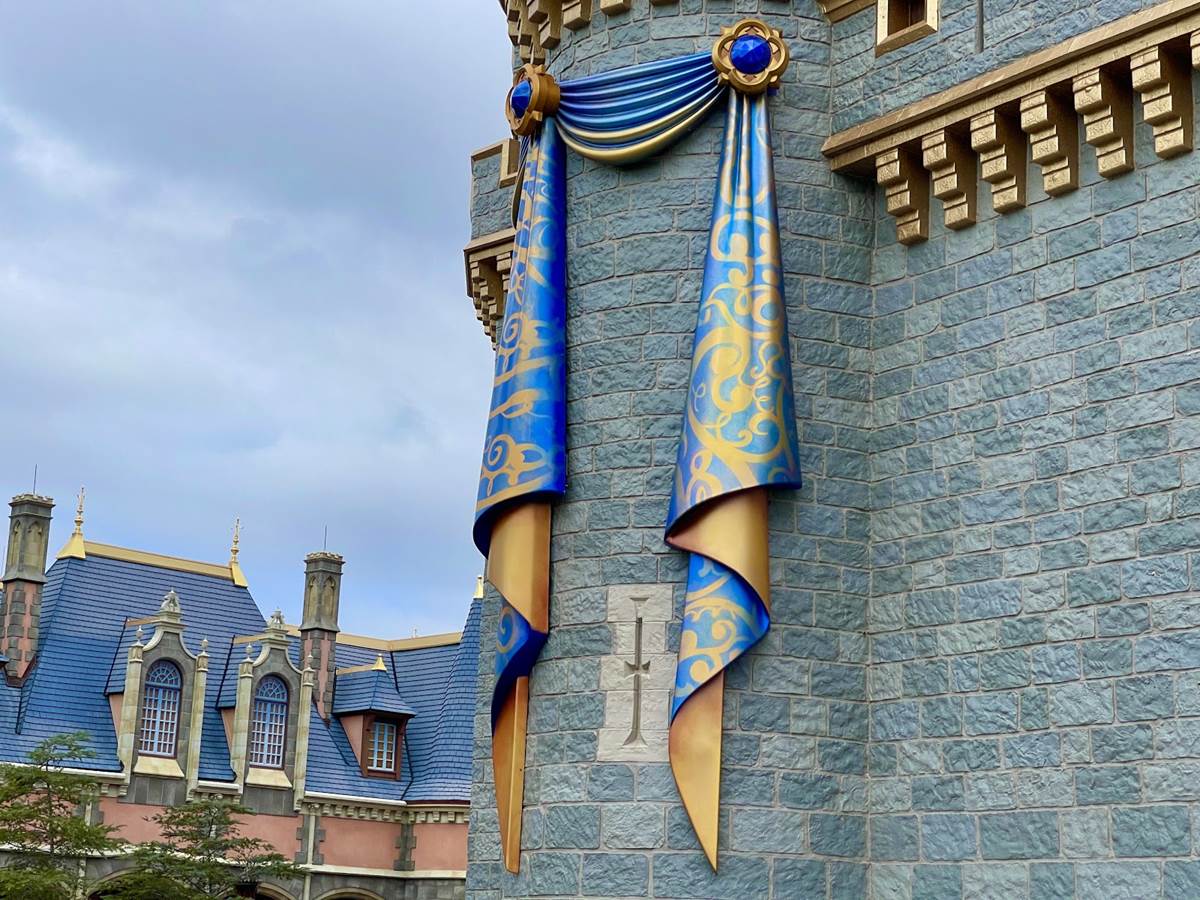 The bunting also sticks to shades of blue and gold, matching the recent golden trim additions to the castle. The filigree on the banners looks evocative of Cinderella’s story while also matching some of the decor inside Cinderella’s Royal Table.