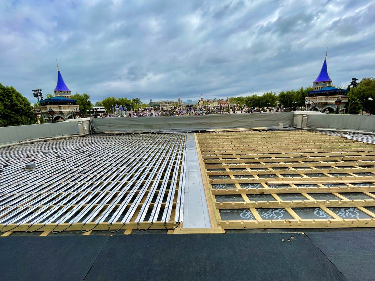 Walking along the path to enter the castle’s breezeway gives Guests an easy look at the work being done on the new stage.