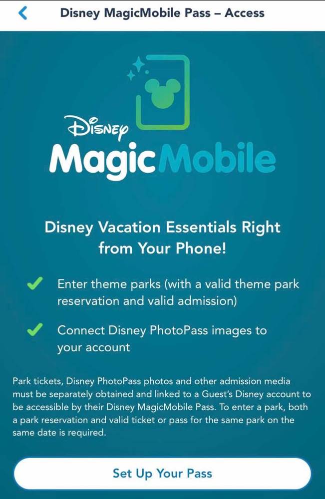 When the update comes to My Disney Experience, the Disney MagicMobile button on the menu screen will switch from “Coming soon” to a page that looks like this, allowing users to set up their pass.