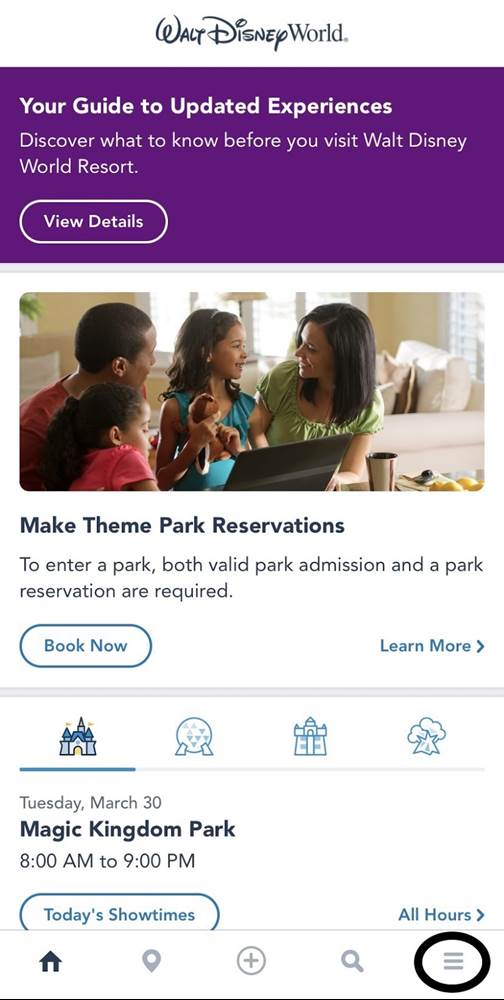 - On the My Disney Experience App, select the menu button on the bottom right.
