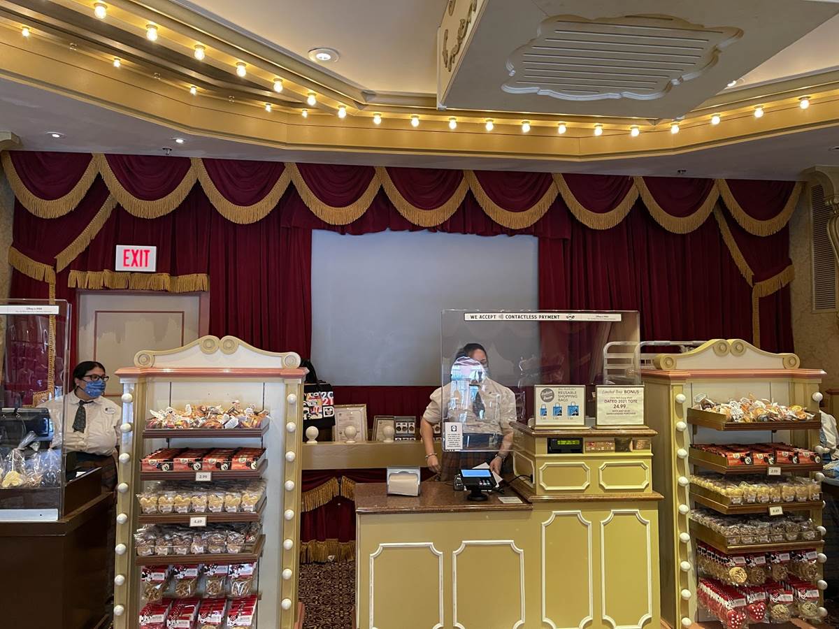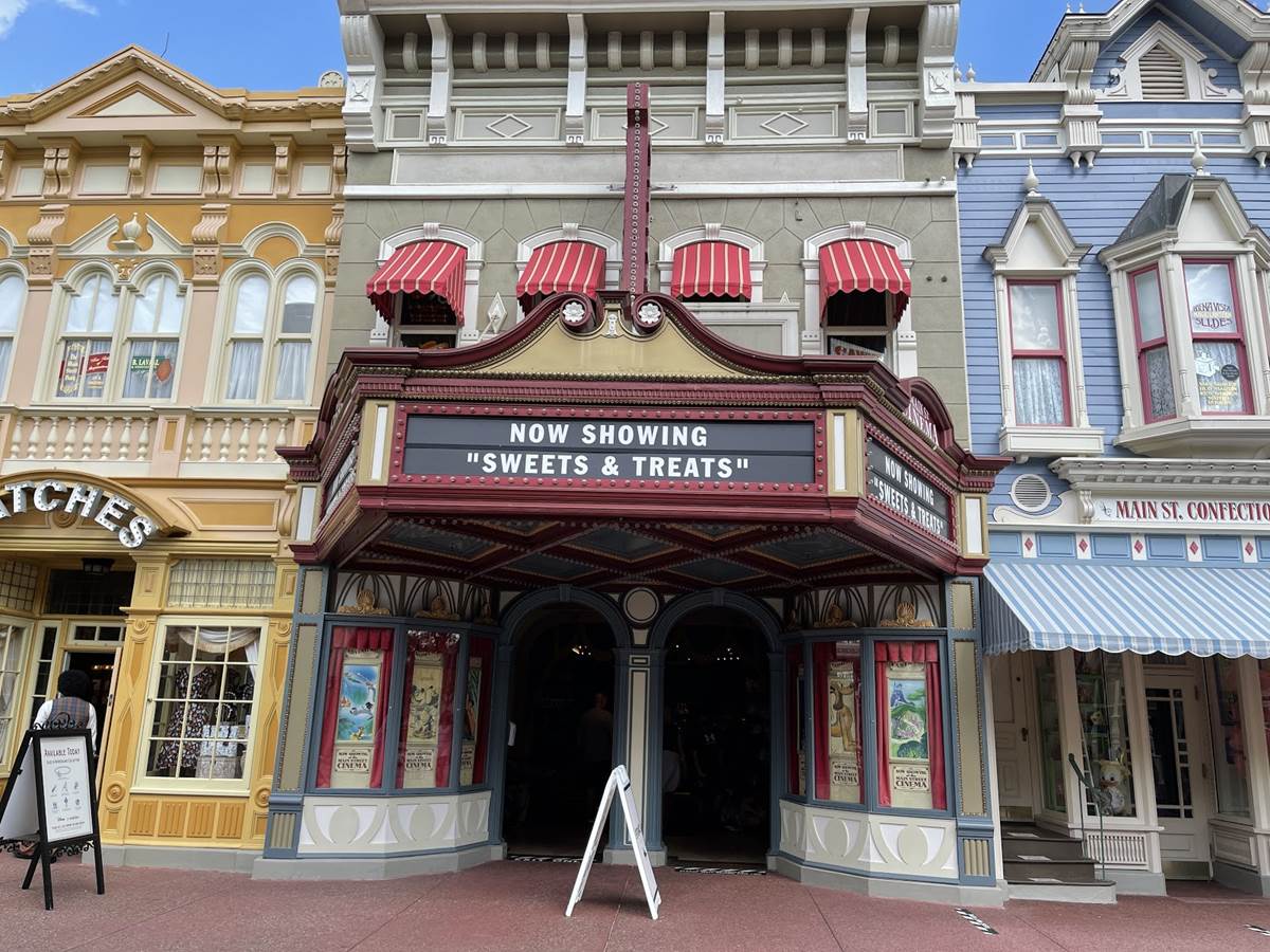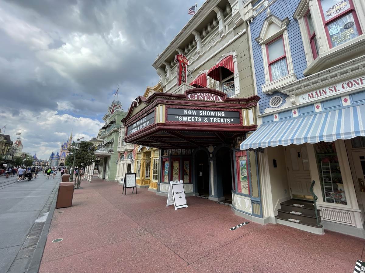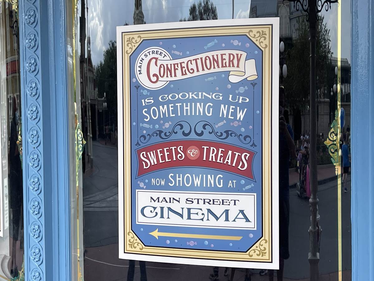In an interesting turn of events, the Main Street Cinema has been populated with relocated candy from the Main Street Confectionary, with the theater marquee advertising that the cinema is now showing “Sweets and Treats.” The walls and shelves that once showcased the Art of Disney, and Virtual Magic Kingdom and actual Cartoon Shorts before that, are now adorned with candy and various offerings.