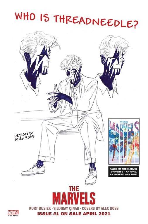 - Writer Kurt Busiek: “We introduce three new characters in THE MARVELS 1 — one who’s very much on a human level, one wrapped up with superhero history and ties beyond Earth, and one who’s outright weird and cosmic and will usher us into a bigger, stranger, deeper world. Threadneedle is that third guy, as I expect you can tell. And yeah, Alex did an astounding design of Threadneedle, didn’t he? Quirky and trippy, and nothing like anyone else Marvel’s had in stories before. And that’s all very intentional. Make sure to keep an eye on him. He’s got fascinating secrets.”