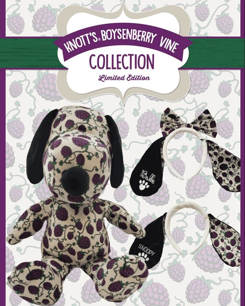 - Fresh from the fields of the farm, Knott’s Boysenberry Vine print adorns this collection of Snoopy Plush & Headbands. This custom plush features Snoopy's iconic sitting pose and infuses him with an all-over Boysenberry print. Black collar and super soft ears help make this plush a must have for the Boysenberry season!