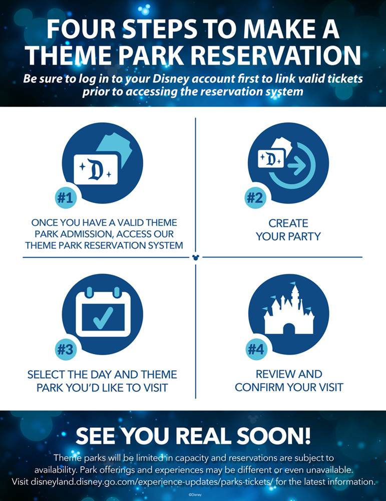 - Theme park reservations will be available online, in advance only, for a specific date, subject to availability.