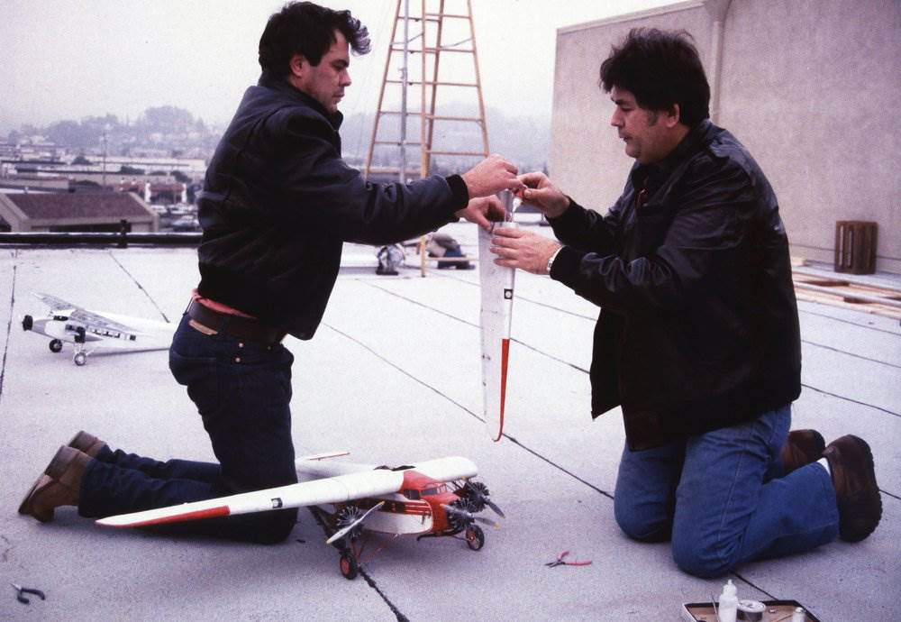 In photo above: ILM Model Makers Ira Keeler (right) with Michael Fulmer working on a miniature Ford Tri-motor aircraft on the roof of ILM's main stage where shooting would later take place for Indiana Jones and The Temple of Doom (1984).