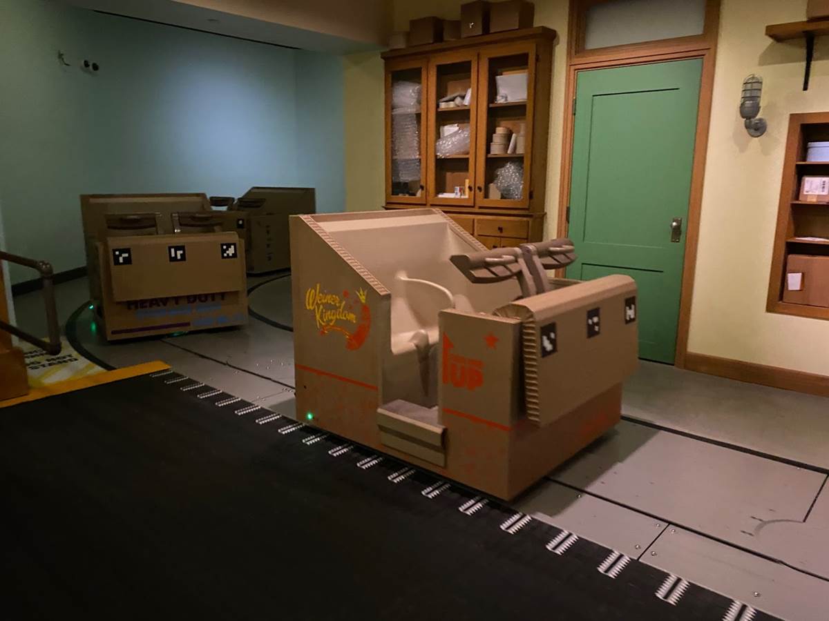 This leads to the loading area, with vehicles that are themed to look like various cardboard boxes.