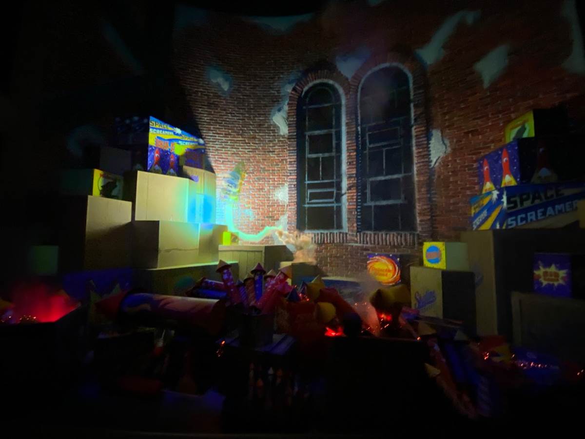 Snowball, other characters, and Guests then find themselves in a fireworks facility with Snowball strapping himself to one as he flies across the room.