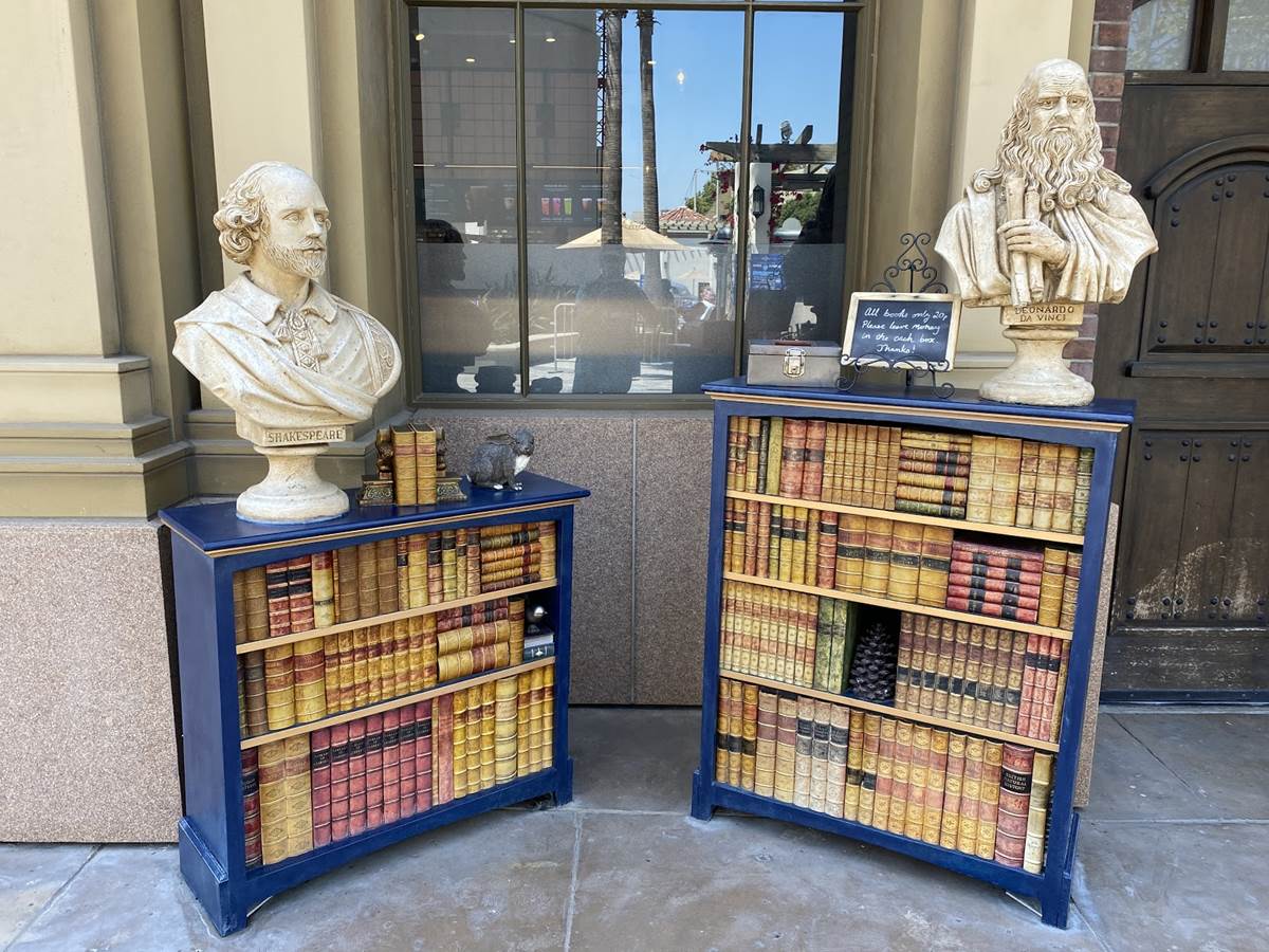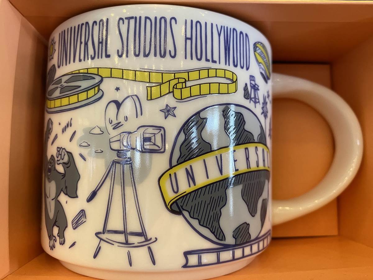 Just inside the park, we find the main entryway and some decorative prop books outside of the Starbucks, where we can find this special Universal Studios Hollywood You Are Here Mug.