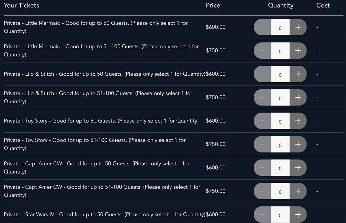 - Private screenings can accommodate up to 100 guests per reservation and varies in price depending on the number of guests expected.