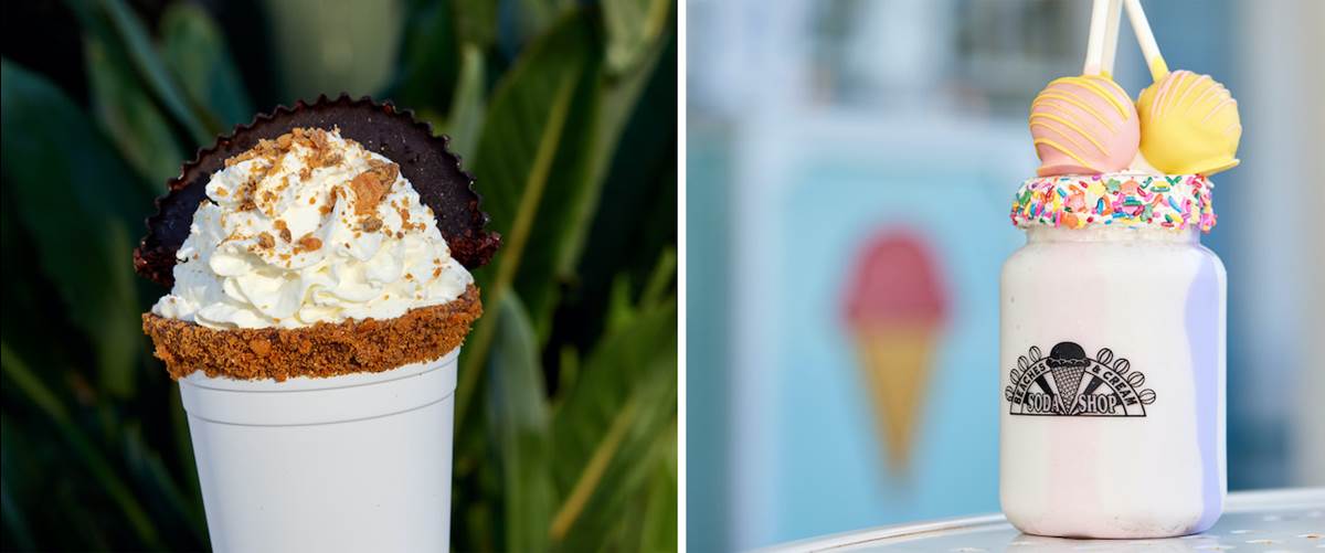 - Chocolate Peanut Butter Explosion Shake – Chocolate ice cream layered with peanut butter sauce topped with whipped cream and garnished with chocolate peanut butter crumbles and a chocolate-dipped peanut butter cake