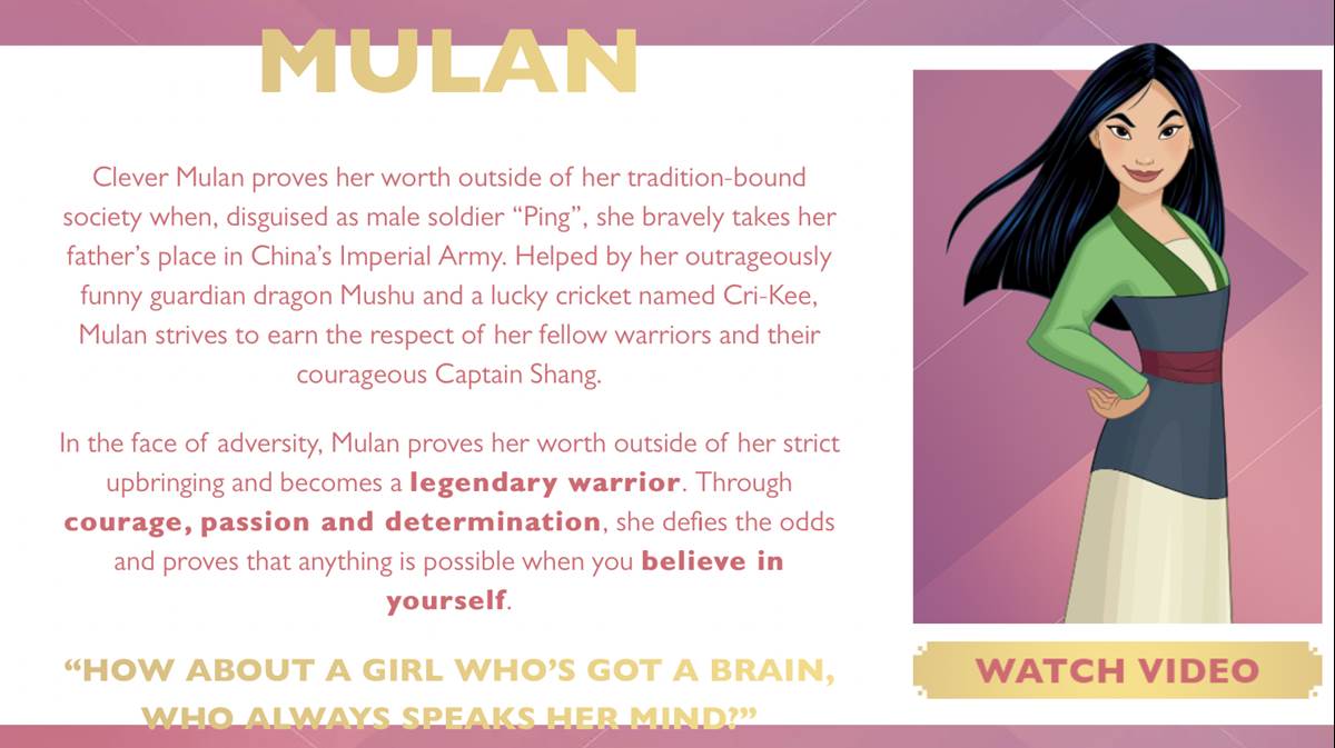 - Using an online Character Story Spinner, children learn more about Disney Princesses and watch trailers designed to help them understand what it means to be kind, brave, and helpful to others.