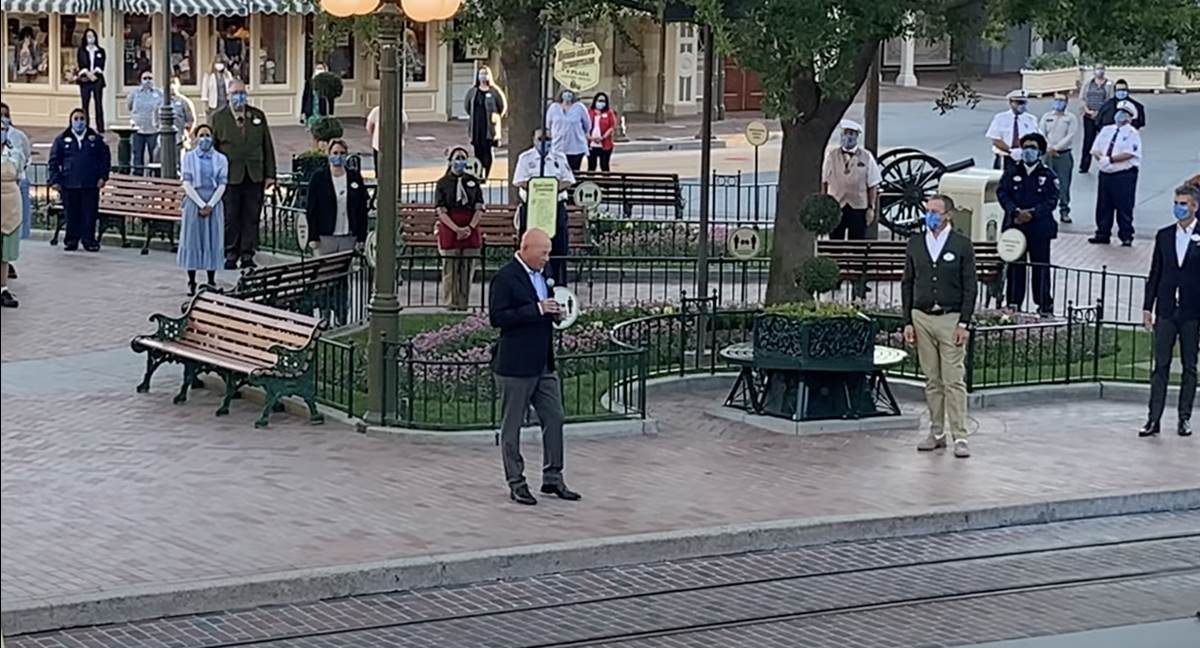 - In a video captured by Theme Park Insider, earlier this morning before the official park reopening, Disneyland held a flag raising ceremony with Chief Executive Officer Bob Chapek, Executive Chairman and Chairman of the Board Bob Iger, Disney Parks, Experiences and Products Chairman Josh D’Amaro, and President of Disneyland Resort Ken Potrock.
