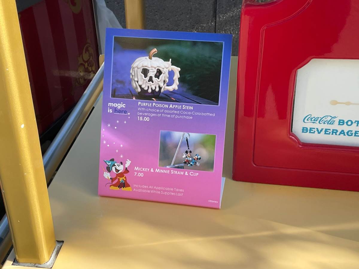 The Fantasyland Churro Cart had some reopening novelties available like the Purple Poison Apple Stein and Mickey & Minnie Straw and Clip available to purchase.