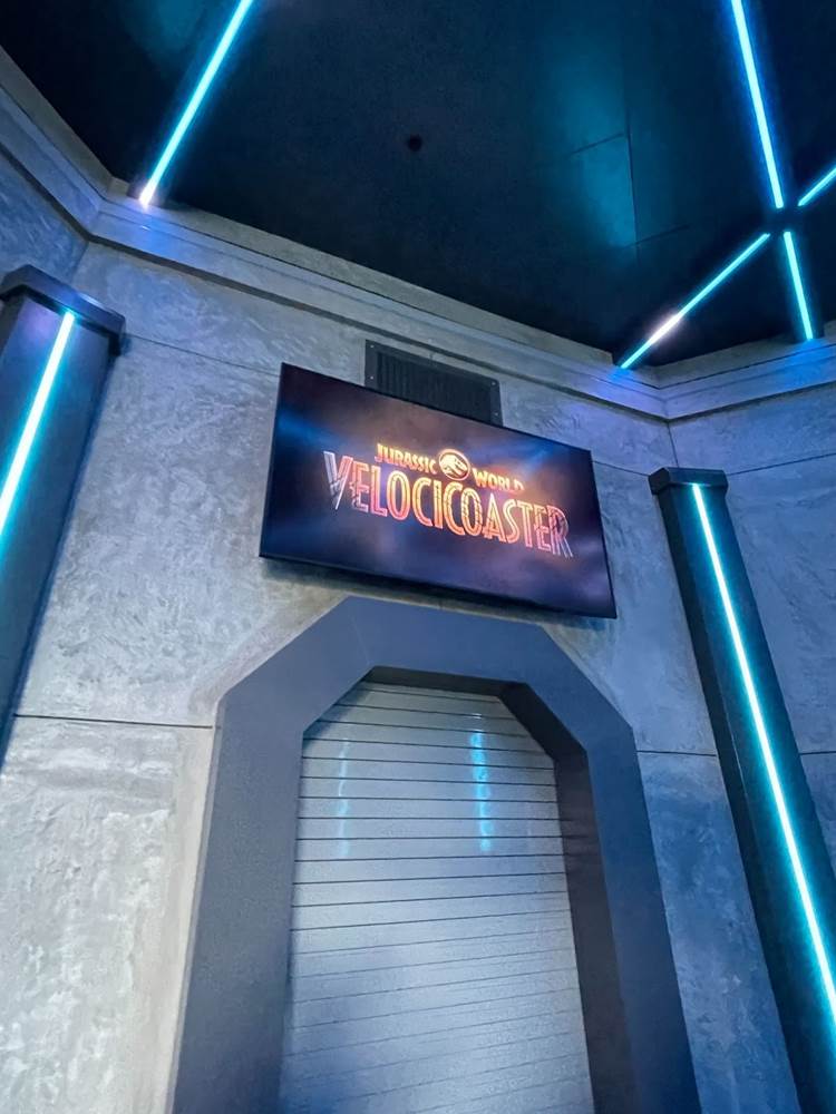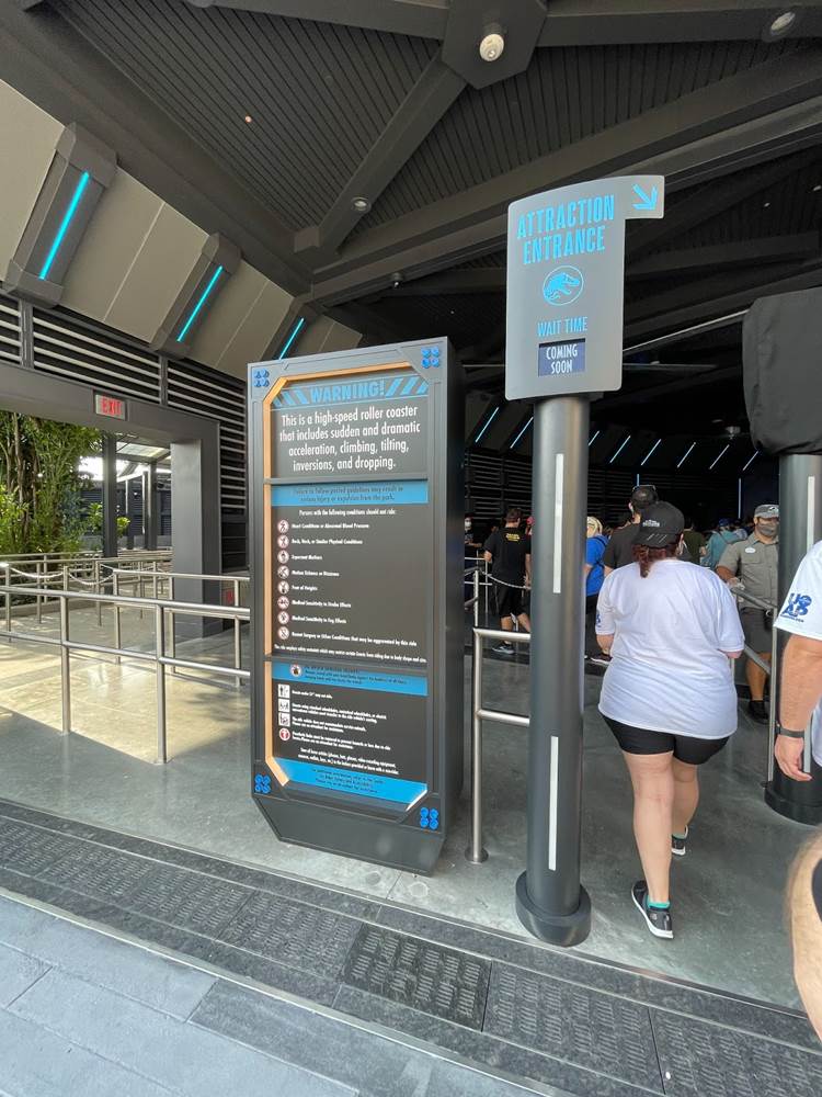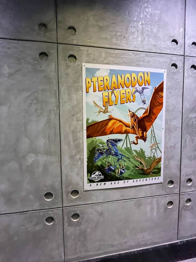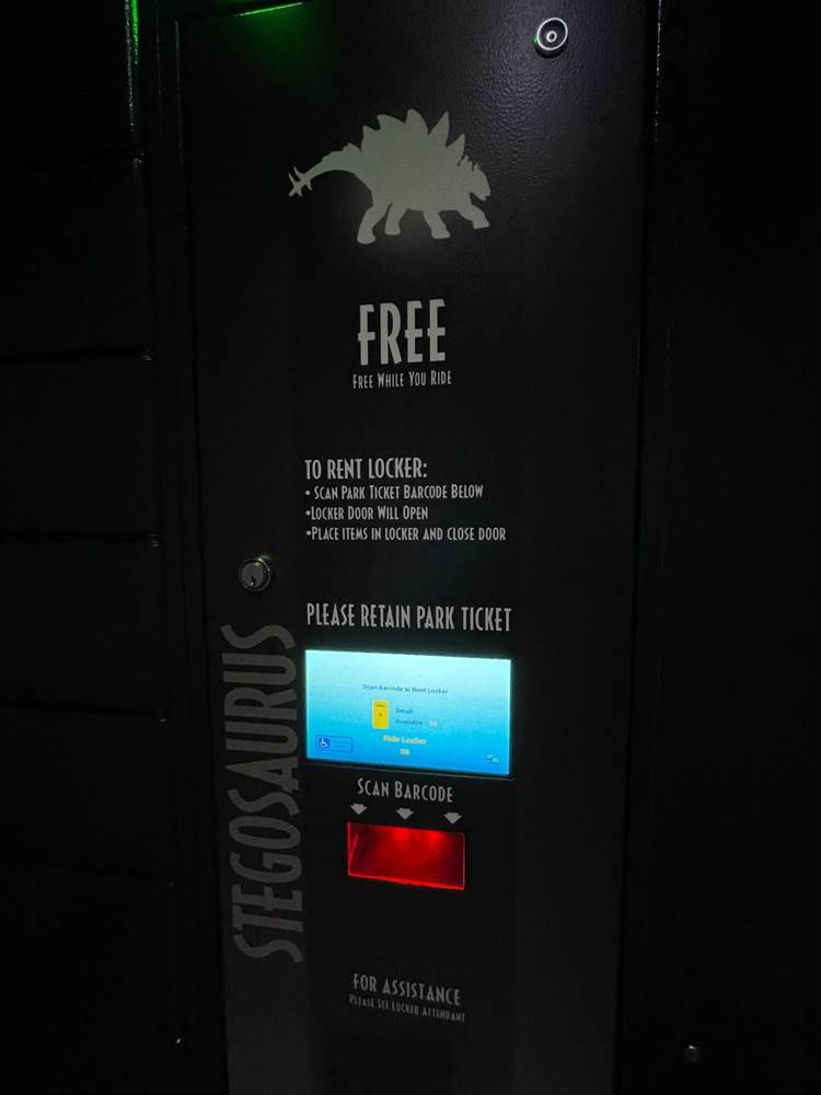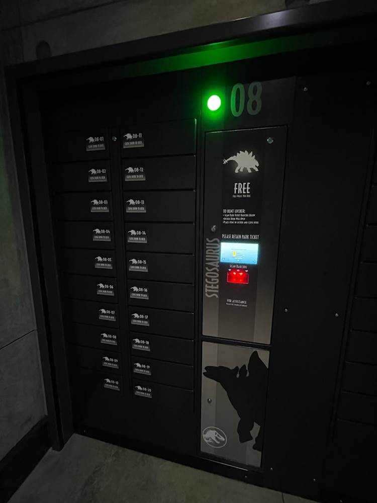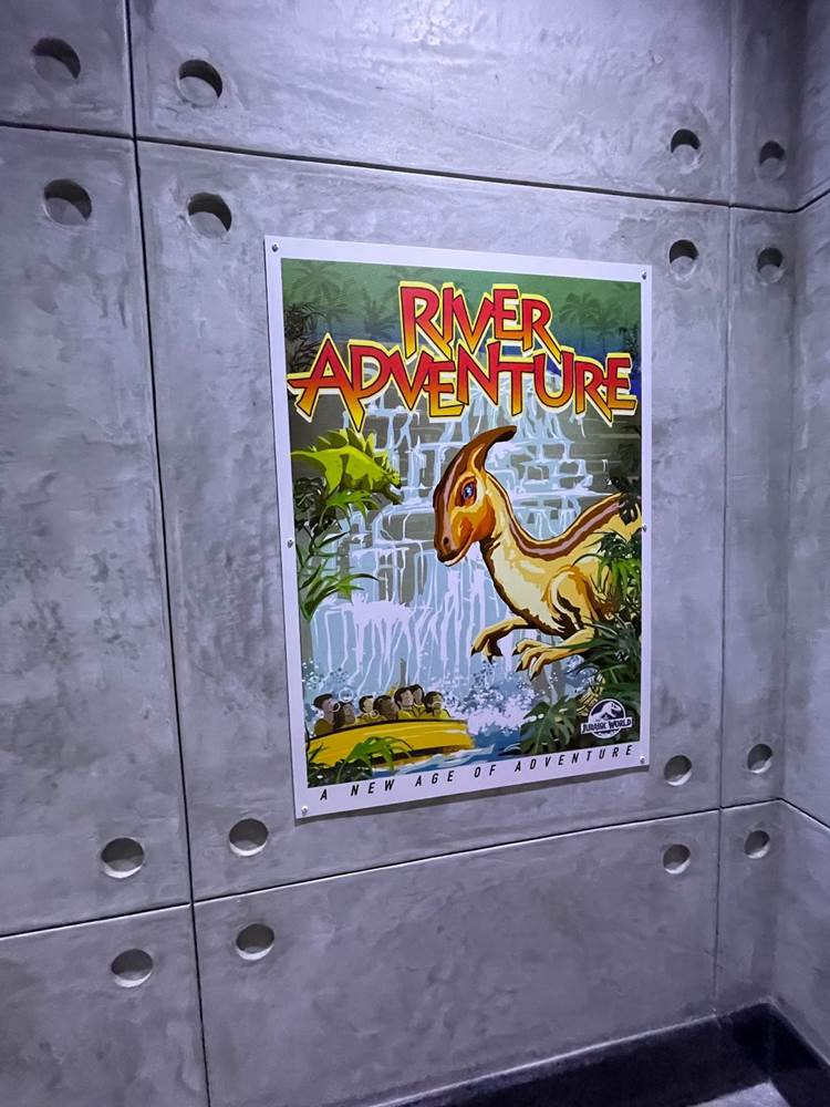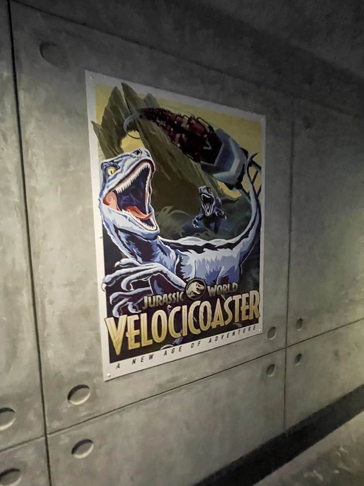 Similar to other coasters at the park, loose items and carry on bags and such are not allowed, and must be stowed in a complimentary locker. The lockers are themed to different dinosaurs to help remember your location, and fans will likely delight over the posters marketing other attractions of Jurassic Park/World, two of which are marked as “coming soon.” Could this be a hint towards a retheme of Camp Jurassic into Camp Cretaceous and/or a refurbishment of the River Adventure to be more like Jurassic World: The Ride at Universal Studios Hollywood? Also, as most coasters in the park feature a test seat, so does Jurassic World Velocicoaster.