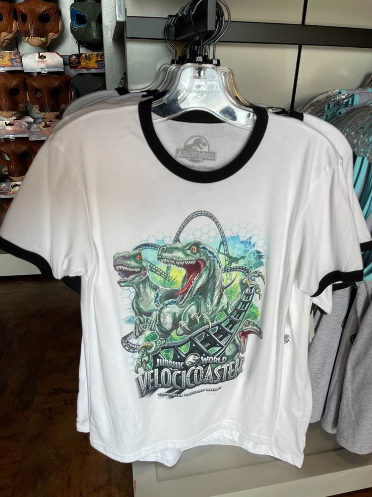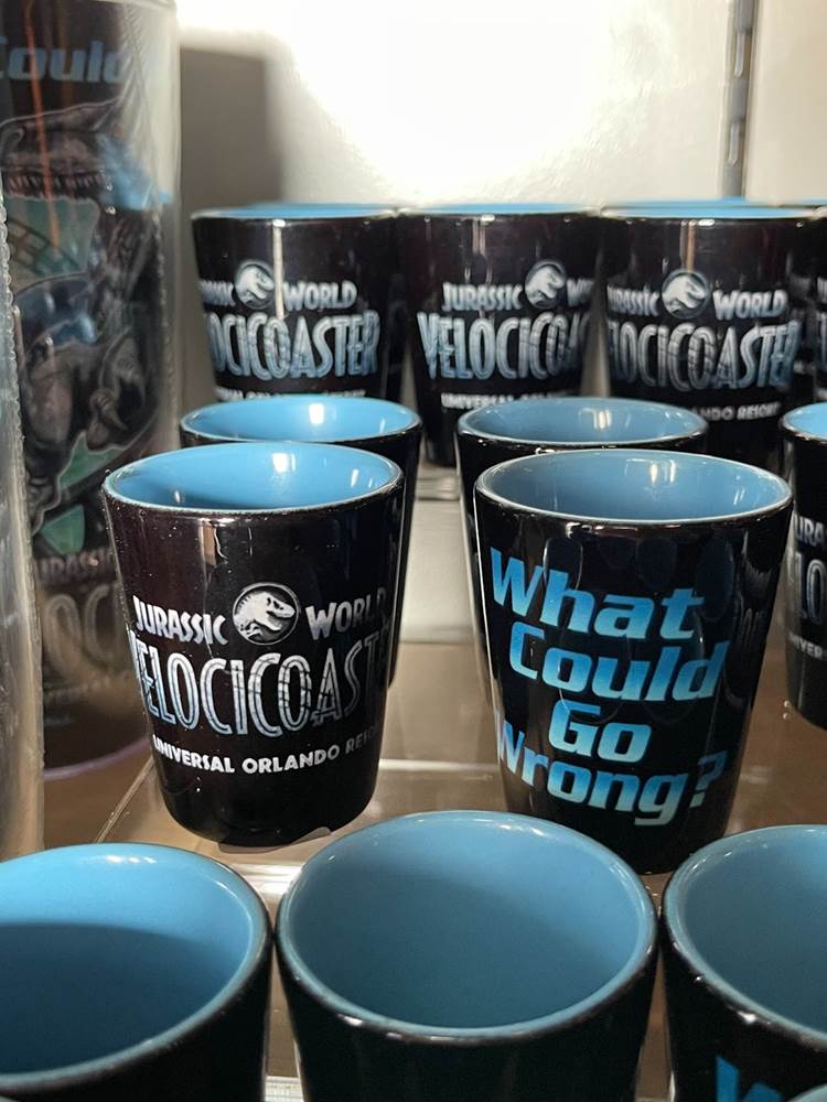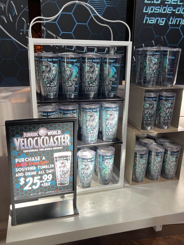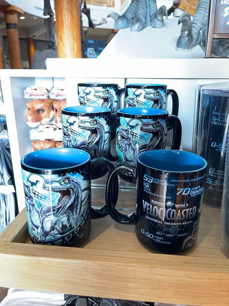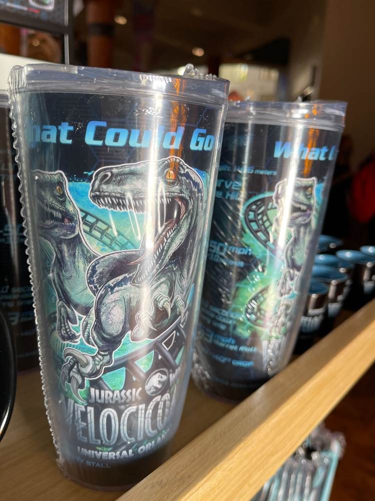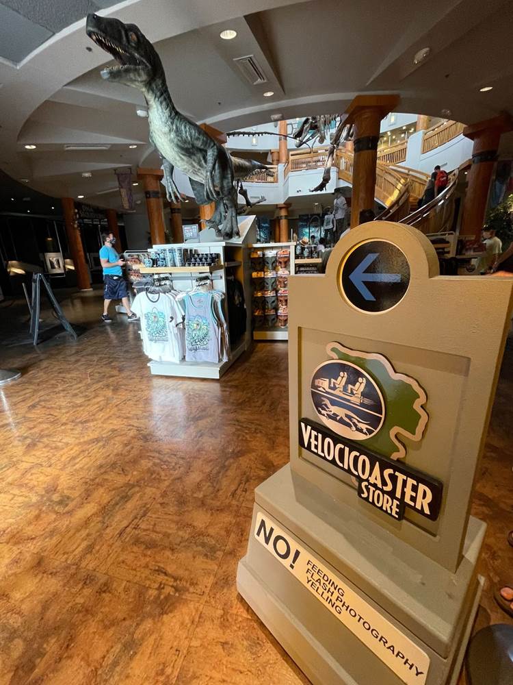 Fans of the Jurassic Park Discovery Center (an interactive area which was home to regular shows wherein guests could have the once in a lifetime opportunity to witness a live dinosaur hatch) might be a bit startled to see that the area modeled after the Visitor’s Center in the original Jurassic Park, has been transformed into the Velocicoaster Store, featuring pins, apparel, lanyards, cups, and more.