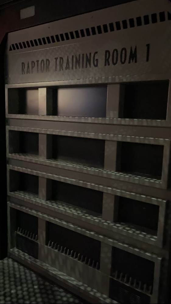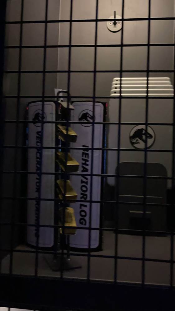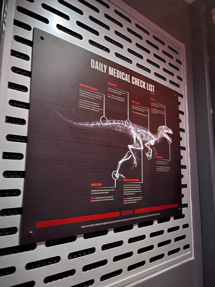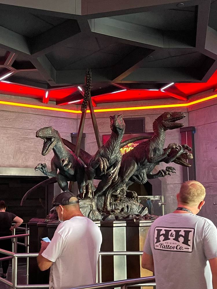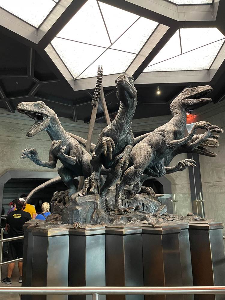The queue features muzzled velociraptors that are clearly alive, blinking, snorting, and trying to break free of their restraints. There are also easter eggs hidden throughout, with books by both Dr. Ian Malcolm and Dr. Alan Grant featured in displays.